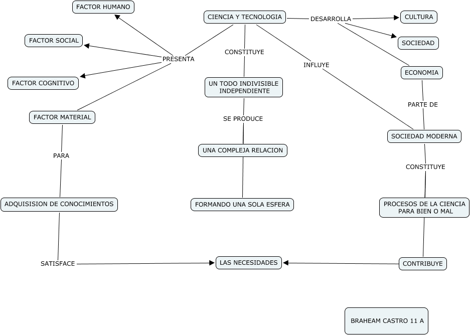 Este Cmap, tiene información relacionada con: BRAHEAM CASTRO, CIENCIA Y TECNOLOGIA DESARROLLA ECONOMIA, CIENCIA Y TECNOLOGIA PRESENTA FACTOR COGNITIVO, SOCIEDAD MODERNA CONSTITUYE PROCESOS DE LA CIENCIA PARA BIEN O MAL, FACTOR MATERIAL PARA ADQUISISION DE CONOCIMIENTOS, CIENCIA Y TECNOLOGIA PRESENTA FACTOR MATERIAL, ADQUISISION DE CONOCIMIENTOS SATISFACE LAS NECESIDADES, SOCIEDAD MODERNA CONSTITUYE CONTRIBUYE, ECONOMIA PARTE DE SOCIEDAD MODERNA, CIENCIA Y TECNOLOGIA INFLUYE SOCIEDAD MODERNA, UN TODO INDIVISIBLE INDEPENDIENTE SE PRODUCE UNA COMPLEJA RELACION, CIENCIA Y TECNOLOGIA DESARROLLA SOCIEDAD, CIENCIA Y TECNOLOGIA PRESENTA FACTOR HUMANO, CIENCIA Y TECNOLOGIA DESARROLLA CULTURA, CIENCIA Y TECNOLOGIA PRESENTA FACTOR SOCIAL, CIENCIA Y TECNOLOGIA CONSTITUYE UN TODO INDIVISIBLE INDEPENDIENTE, CONTRIBUYE ???? LAS NECESIDADES, UN TODO INDIVISIBLE INDEPENDIENTE SE PRODUCE FORMANDO UNA SOLA ESFERA