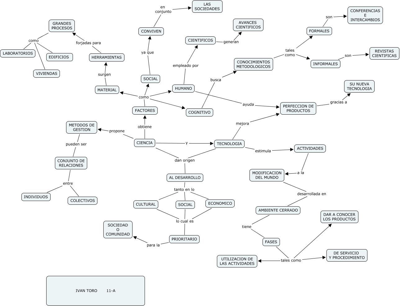 Este Cmap, tiene información relacionada con: IVAN TORO CIENCIA Y LA TECNOLOGIA, FACTORES como MATERIAL, HUMANO empleado por CIENTIFICOS, AL DESARROLLO tanto en lo ECONOMICO, CIENCIA dan origen AL DESARROLLO, TECNOLOGIA estimula ACTIVIDADES, AL DESARROLLO tanto en lo CULTURAL, PERFECCION DE PRODUCTOS gracias a SU NUEVA TECNOLOGIA, CONOCIMIENTOS METODOLOGICOS tales como FORMALES, CONVIVEN en conjunto LAS SOCIEDADES, CIENCIA y TECNOLOGIA, CONJUNTO DE RELACIONES entre COLECTIVOS, ECONOMICO lo cual es PRIORITARIO, FASES tales como UTILIZACION DE LAS ACTIVIDADES, CIENCIA propone METODOS DE GESTION, CONOCIMIENTOS METODOLOGICOS tales como INFORMALES, FASES tales como DE SERVICIO Y PROCEDIMIENTO, AL DESARROLLO tanto en lo SOCIAL, COGNITIVO busca CONOCIMIENTOS METODOLOGICOS, GRANDES PROCESOS como EDIFICIOS, TECNOLOGIA mejora PERFECCION DE PRODUCTOS