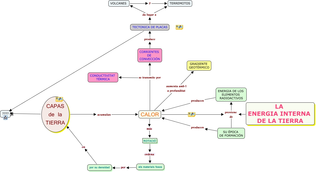 Este Cmap, tiene información relacionada con: geodinamica interna, corteza estado físico es sólido, Núcleo externo características 4000-6000 °C líquido desaparecen lasondas S, aumenta la velocida de las P, CALOR aumenta amb l a profunditat GRADIENTE GEOTÉRMICO, NÚCLEO cuyo espesor es 3478 km, MANTO cuyo espesor es 2885 km, corteza puede ser corteza oceánica, NÚCLEO se divide en Núcleo interno, corteza oceánica características • homogénea • 6-8 km • sedimentos marinos • lava basáltica almohadillada • diques basálticos • gabros, MANTO se divide en manto superior, NÚCLEO está compuesto por metales (fe, ni,si,s), ROTACIÓ ordena els materials fosos, CALOR se transmite por CONDUCTIVITAT TÉRMICA, CALOR se transmite por CORRIENTES DE CONVECCIÓN, TECTONICA DE PLACAS da lugar a VOLCANES, CAPAS de la TIERRA que son corteza, CALOR proviene de ENERGIA DE LOS ELEMENTOS RADIOACTIVOS, CALOR más ROTACIÓ, TECTONICA DE PLACAS da lugar a TERREMOTOS, TECTONICA DE PLACAS se manifiesta en la corteza, Núcleo interno características 6.700 °C sólido aparecen las ondas S, aumenta la velocidad de las ondas P