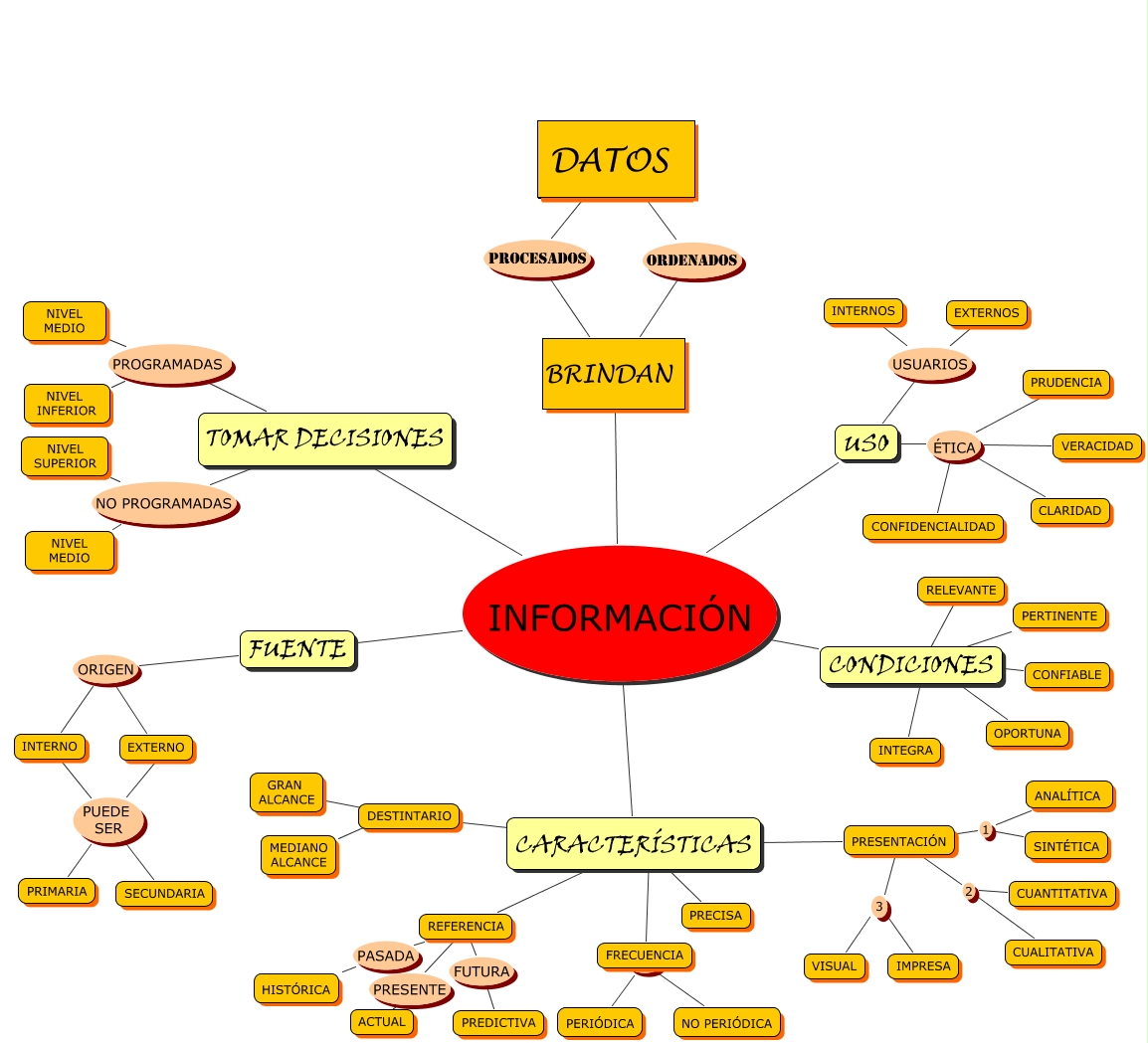 Este Cmap, tiene información relacionada con: LA INFORMACIÓN, REFERENCIA PASADA HISTÓRICA, PRESENTACIÓN 3 IMPRESA, CARACTERÍSTICAS ???? PRECISA, FUENTE ORIGEN INTERNO, PRESENTACIÓN 2 CUALITATIVA, BRINDAN INFORMACIÓN CONDICIONES, USO USUARIOS INTERNOS, DESTINTARIO ???? GRAN ALCANCE, BRINDAN INFORMACIÓN CARACTERÍSTICAS, USO ÉTICA PRUDENCIA, CARACTERÍSTICAS ???? PRESENTACIÓN, CARACTERÍSTICAS ???? DESTINTARIO, FRECUENCIA ???? NO PERIÓDICA, CONDICIONES ???? INTEGRA, PRESENTACIÓN 1 ANALÍTICA, TOMAR DECISIONES NO PROGRAMADAS NIVEL MEDIO, USO ÉTICA VERACIDAD, TOMAR DECISIONES PROGRAMADAS NIVEL INFERIOR, PRESENTACIÓN 1 SINTÉTICA, BRINDAN ORDENADOS DATOS