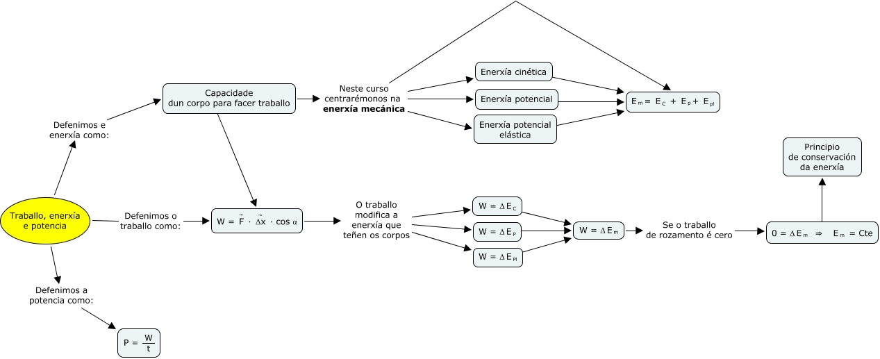Este mapa conceptual ten información relativa a: traballo4eso, Traballo, enerxía e potencia Defenimos a potencia como: <math xmlns="http://www.w3.org/1998/Math/MathML"> <mrow> <mtext> P = </mtext> <mfrac> <mtext> W </mtext> <mtext> t </mtext> </mfrac> </mrow> </math>, <math xmlns="http://www.w3.org/1998/Math/MathML"> <mrow> <mtext> W = Δ </mtext> <mmultiscripts> <mtext> E </mtext> <mtext> P </mtext> <none/> </mmultiscripts> </mrow> </math> ???? <math xmlns="http://www.w3.org/1998/Math/MathML"> <mrow> <mtext> W = Δ </mtext> <mmultiscripts> <mtext> E </mtext> <mtext> m </mtext> <none/> </mmultiscripts> </mrow> </math>, Capacidade dun corpo para facer traballo Neste curso centrarémonos na enerxía mecánica Enerxía potencial elástica, <math xmlns="http://www.w3.org/1998/Math/MathML"> <mrow> <mtext> W = Δ </mtext> <mmultiscripts> <mtext> E </mtext> <mtext> C </mtext> <none/> </mmultiscripts> </mrow> </math> ???? <math xmlns="http://www.w3.org/1998/Math/MathML"> <mrow> <mtext> W = Δ </mtext> <mmultiscripts> <mtext> E </mtext> <mtext> m </mtext> <none/> </mmultiscripts> </mrow> </math>, Traballo, enerxía e potencia Defenimos e enerxía como: Capacidade dun corpo para facer traballo, <math xmlns="http://www.w3.org/1998/Math/MathML"> <mrow> <mtext> W = Δ </mtext> <mmultiscripts> <mtext> E </mtext> <mtext> Pl </mtext> <none/> </mmultiscripts> </mrow> </math> ???? <math xmlns="http://www.w3.org/1998/Math/MathML"> <mrow> <mtext> W = Δ </mtext> <mmultiscripts> <mtext> E </mtext> <mtext> m </mtext> <none/> </mmultiscripts> </mrow> </math>, <math xmlns="http://www.w3.org/1998/Math/MathML"> <mrow> <mtext> W = </mtext> <munderover> <mtext> F </mtext> <none/> <mtext> → </mtext> </munderover> <mtext> · </mtext> <munderover> <mtext> Δx </mtext> <none/> <mtext> → </mtext> </munderover> <mtext> · cos α </mtext> </mrow> </math> O traballo modifica a enerxía que teñen os corpos <math xmlns="http://www.w3.org/1998/Math/MathML"> <mrow> <mtext> W = Δ </mtext> <mmultiscripts> <mtext> E </mtext> <mtext> C </mtext> <none/> </mmultiscripts> </mrow> </math>, <math xmlns="http://www.w3.org/1998/Math/MathML"> <mrow> <mtext> W = Δ </mtext> <mmultiscripts> <mtext> E </mtext> <mtext> m </mtext> <none/> </mmultiscripts> </mrow> </math> Se o traballo de rozamento é cero <math xmlns="http://www.w3.org/1998/Math/MathML"> <mrow> <mtext> 0 = Δ </mtext> <mmultiscripts> <mtext> E </mtext> <mtext> m </mtext> <none/> </mmultiscripts> <mtext> ⇒ </mtext> <mmultiscripts> <mtext> E </mtext> <mtext> m </mtext> <none/> </mmultiscripts> <mtext> = Cte </mtext> </mrow> </math>, Enerxía cinética ???? <math xmlns="http://www.w3.org/1998/Math/MathML"> <mrow> <mmultiscripts> <mtext> E </mtext> <mtext> m </mtext> <none/> </mmultiscripts> <mtext> = </mtext> <mmultiscripts> <mtext> E </mtext> <mtext> C </mtext> <none/> </mmultiscripts> <mtext> + </mtext> <mmultiscripts> <mtext> E </mtext> <mtext> p </mtext> <none/> </mmultiscripts> <mtext> + </mtext> <mmultiscripts> <mtext> E </mtext> <mtext> pl </mtext> <none/> </mmultiscripts> </mrow> </math>, Capacidade dun corpo para facer traballo Neste curso centrarémonos na enerxía mecánica Enerxía cinética, Capacidade dun corpo para facer traballo ???? <math xmlns="http://www.w3.org/1998/Math/MathML"> <mrow> <mtext> W = </mtext> <munderover> <mtext> F </mtext> <none/> <mtext> → </mtext> </munderover> <mtext> · </mtext> <munderover> <mtext> Δx </mtext> <none/> <mtext> → </mtext> </munderover> <mtext> · cos α </mtext> </mrow> </math>, <math xmlns="http://www.w3.org/1998/Math/MathML"> <mrow> <mtext> 0 = Δ </mtext> <mmultiscripts> <mtext> E </mtext> <mtext> m </mtext> <none/> </mmultiscripts> <mtext> ⇒ </mtext> <mmultiscripts> <mtext> E </mtext> <mtext> m </mtext> <none/> </mmultiscripts> <mtext> = Cte </mtext> </mrow> </math> ???? Principio de conservación da enerxía, Traballo, enerxía e potencia Defenimos o traballo como: <math xmlns="http://www.w3.org/1998/Math/MathML"> <mrow> <mtext> W = </mtext> <munderover> <mtext> F </mtext> <none/> <mtext> → </mtext> </munderover> <mtext> · </mtext> <munderover> <mtext> Δx </mtext> <none/> <mtext> → </mtext> </munderover> <mtext> · cos α </mtext> </mrow> </math>, Capacidade dun corpo para facer traballo Neste curso centrarémonos na enerxía mecánica <math xmlns="http://www.w3.org/1998/Math/MathML"> <mrow> <mmultiscripts> <mtext> E </mtext> <mtext> m </mtext> <none/> </mmultiscripts> <mtext> = </mtext> <mmultiscripts> <mtext> E </mtext> <mtext> C </mtext> <none/> </mmultiscripts> <mtext> + </mtext> <mmultiscripts> <mtext> E </mtext> <mtext> p </mtext> <none/> </mmultiscripts> <mtext> + </mtext> <mmultiscripts> <mtext> E </mtext> <mtext> pl </mtext> <none/> </mmultiscripts> </mrow> </math>, Enerxía potencial ???? <math xmlns="http://www.w3.org/1998/Math/MathML"> <mrow> <mmultiscripts> <mtext> E </mtext> <mtext> m </mtext> <none/> </mmultiscripts> <mtext> = </mtext> <mmultiscripts> <mtext> E </mtext> <mtext> C </mtext> <none/> </mmultiscripts> <mtext> + </mtext> <mmultiscripts> <mtext> E </mtext> <mtext> p </mtext> <none/> </mmultiscripts> <mtext> + </mtext> <mmultiscripts> <mtext> E </mtext> <mtext> pl </mtext> <none/> </mmultiscripts> </mrow> </math>, <math xmlns="http://www.w3.org/1998/Math/MathML"> <mrow> <mtext> W = </mtext> <munderover> <mtext> F </mtext> <none/> <mtext> → </mtext> </munderover> <mtext> · </mtext> <munderover> <mtext> Δx </mtext> <none/> <mtext> → </mtext> </munderover> <mtext> · cos α </mtext> </mrow> </math> O traballo modifica a enerxía que teñen os corpos <math xmlns="http://www.w3.org/1998/Math/MathML"> <mrow> <mtext> W = Δ </mtext> <mmultiscripts> <mtext> E </mtext> <mtext> Pl </mtext> <none/> </mmultiscripts> </mrow> </math>, Capacidade dun corpo para facer traballo Neste curso centrarémonos na enerxía mecánica Enerxía potencial, <math xmlns="http://www.w3.org/1998/Math/MathML"> <mrow> <mtext> W = </mtext> <munderover> <mtext> F </mtext> <none/> <mtext> → </mtext> </m