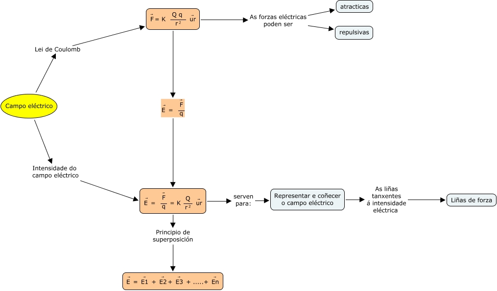 Este mapa conceptual ten información relativa a: electrico1bach, <math xmlns="http://www.w3.org/1998/Math/MathML"> <mrow> <munderover> <mtext> E </mtext> <none/> <mtext> → </mtext> </munderover> <mtext> = </mtext> <mfrac> <munderover> <mtext> F </mtext> <none/> <mtext> → </mtext> </munderover> <mtext> q </mtext> </mfrac> <mtext> = K </mtext> <mfrac> <mtext> Q </mtext> <mmultiscripts> <mtext> r </mtext> <none/> <mtext> 2 </mtext> </mmultiscripts> </mfrac> <mtext> </mtext> <munderover> <mtext> ur </mtext> <none/> <mtext> → </mtext> </munderover> </mrow> </math> Principio de superposición <math xmlns="http://www.w3.org/1998/Math/MathML"> <mrow> <munderover> <mtext> E </mtext> <none/> <mtext> → </mtext> </munderover> <mtext> = </mtext> <munderover> <mtext> E1 </mtext> <none/> <mtext> → </mtext> </munderover> <mtext> + </mtext> <munderover> <mtext> E2 </mtext> <none/> <mtext> → </mtext> </munderover> <mtext> + </mtext> <munderover> <mtext> E3 </mtext> <none/> <mtext> → </mtext> </munderover> <mtext> + .....+ </mtext> <munderover> <mtext> En </mtext> <none/> <mtext> → </mtext> </munderover> </mrow> </math>, Representar e coñecer o campo eléctrico As liñas tanxentes á intensidade eléctrica Liñas de forza, <math xmlns="http://www.w3.org/1998/Math/MathML"> <munderover> <mtext> F </mtext> <none/> <mtext> → </mtext> </munderover> <mtext> = K </mtext> <mfrac> <mtext> Q q </mtext> <mrow> <mmultiscripts> <mtext> r </mtext> <none/> <mtext> 2 </mtext> </mmultiscripts> </mrow> </mfrac> <mtext> </mtext> <munderover> <mtext> ur </mtext> <none/> <mtext> → </mtext> </munderover> </math> <math xmlns="http://www.w3.org/1998/Math/MathML"> <mrow> <munderover> <mtext> E </mtext> <none/> <mtext> → </mtext> </munderover> <mtext> = </mtext> <mfrac> <munderover> <mtext> F </mtext> <none/> <mtext> → </mtext> </munderover> <mtext> q </mtext> </mfrac> </mrow> </math> <math xmlns="http://www.w3.org/1998/Math/MathML"> <mrow> <munderover> <mtext> E </mtext> <none/> <mtext> → </mtext> </munderover> <mtext> = </mtext> <mfrac> <munderover> <mtext> F </mtext> <none/> <mtext> → </mtext> </munderover> <mtext> q </mtext> </mfrac> <mtext> = K </mtext> <mfrac> <mtext> Q </mtext> <mmultiscripts> <mtext> r </mtext> <none/> <mtext> 2 </mtext> </mmultiscripts> </mfrac> <mtext> </mtext> <munderover> <mtext> ur </mtext> <none/> <mtext> → </mtext> </munderover> </mrow> </math>, <math xmlns="http://www.w3.org/1998/Math/MathML"> <mrow> <munderover> <mtext> E </mtext> <none/> <mtext> → </mtext> </munderover> <mtext> = </mtext> <mfrac> <munderover> <mtext> F </mtext> <none/> <mtext> → </mtext> </munderover> <mtext> q </mtext> </mfrac> <mtext> = K </mtext> <mfrac> <mtext> Q </mtext> <mmultiscripts> <mtext> r </mtext> <none/> <mtext> 2 </mtext> </mmultiscripts> </mfrac> <mtext> </mtext> <munderover> <mtext> ur </mtext> <none/> <mtext> → </mtext> </munderover> </mrow> </math> serven para: Representar e coñecer o campo eléctrico, <math xmlns="http://www.w3.org/1998/Math/MathML"> <munderover> <mtext> F </mtext> <none/> <mtext> → </mtext> </munderover> <mtext> = K </mtext> <mfrac> <mtext> Q q </mtext> <mrow> <mmultiscripts> <mtext> r </mtext> <none/> <mtext> 2 </mtext> </mmultiscripts> </mrow> </mfrac> <mtext> </mtext> <munderover> <mtext> ur </mtext> <none/> <mtext> → </mtext> </munderover> </math> As forzas eléctricas poden ser atracticas, <math xmlns="http://www.w3.org/1998/Math/MathML"> <munderover> <mtext> F </mtext> <none/> <mtext> → </mtext> </munderover> <mtext> = K </mtext> <mfrac> <mtext> Q q </mtext> <mrow> <mmultiscripts> <mtext> r </mtext> <none/> <mtext> 2 </mtext> </mmultiscripts> </mrow> </mfrac> <mtext> </mtext> <munderover> <mtext> ur </mtext> <none/> <mtext> → </mtext> </munderover> </math> As forzas eléctricas poden ser repulsivas, Campo eléctrico Intensidade do campo eléctrico <math xmlns="http://www.w3.org/1998/Math/MathML"> <mrow> <munderover> <mtext> E </mtext> <none/> <mtext> → </mtext> </munderover> <mtext> = </mtext> <mfrac> <munderover> <mtext> F </mtext> <none/> <mtext> → </mtext> </munderover> <mtext> q </mtext> </mfrac> <mtext> = K </mtext> <mfrac> <mtext> Q </mtext> <mmultiscripts> <mtext> r </mtext> <none/> <mtext> 2 </mtext> </mmultiscripts> </mfrac> <mtext> </mtext> <munderover> <mtext> ur </mtext> <none/> <mtext> → </mtext> </munderover> </mrow> </math>, Campo eléctrico Lei de Coulomb <math xmlns="http://www.w3.org/1998/Math/MathML"> <munderover> <mtext> F </mtext> <none/> <mtext> → </mtext> </munderover> <mtext> = K </mtext> <mfrac> <mtext> Q q </mtext> <mrow> <mmultiscripts> <mtext> r </mtext> <none/> <mtext> 2 </mtext> </mmultiscripts> </mrow> </mfrac> <mtext> </mtext> <munderover> <mtext> ur </mtext> <none/> <mtext> → </mtext> </munderover> </math>