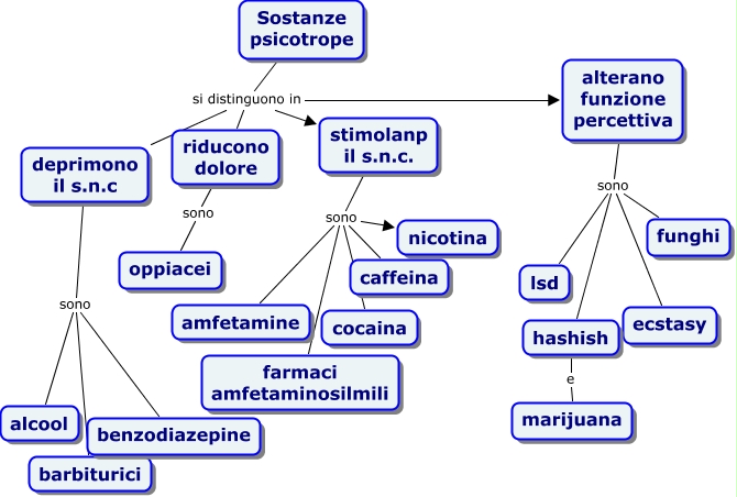 Questa Cmap, creata con IHMC CmapTools, contiene informazioni relative a: Sostanze_psicotrope, Sostanze psicotrope si distinguono in stimolanp il s.n.c., alterano funzione percettiva sono funghi, alterano funzione percettiva sono ecstasy, deprimono il s.n.c sono barbiturici, stimolanp il s.n.c. sono amfetamine, hashish e marijuana, stimolanp il s.n.c. sono cocaina, deprimono il s.n.c sono alcool, alterano funzione percettiva sono hashish, riducono dolore sono oppiacei, Sostanze psicotrope si distinguono in deprimono il s.n.c, stimolanp il s.n.c. sono farmaci amfetaminosilmili, Sostanze psicotrope si distinguono in riducono dolore, stimolanp il s.n.c. sono nicotina, Sostanze psicotrope si distinguono in alterano funzione percettiva, alterano funzione percettiva sono lsd, stimolanp il s.n.c. sono caffeina, deprimono il s.n.c sono benzodiazepine