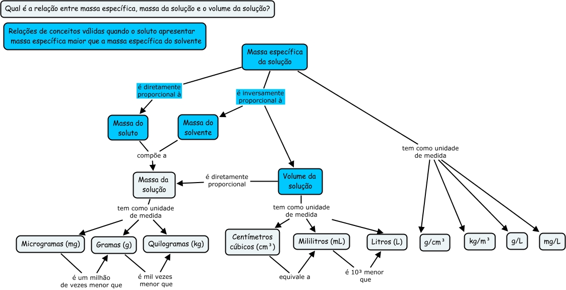 Esse mapa conceitual, produzido no IHMC CmapTools, tem a informação relacionada a: Massa específica 2ºC 2011, Massa da solução tem como unidade de medida Microgramas (mg), Volume da solução tem como unidade de medida Litros (L), Volume da solução tem como unidade de medida Mililitros (mL), Microgramas (mg) é um milhão de vezes menor que Gramas (g), Volume da solução é diretamente proporcional Massa da solução, Massa específica da solução tem como unidade de medida kg/m³, Massa da solução tem como unidade de medida Gramas (g), Volume da solução tem como unidade de medida Centímetros cúbicos (cm³), Mililitros (mL) é 10³ menor que Litros (L), Massa específica da solução é diretamente proporcional à Massa do soluto, Massa específica da solução é inversamente proporcional à Volume da solução, Centímetros cúbicos (cm³) equivale a Mililitros (mL), Massa específica da solução é inversamente proporcional à Massa do solvente, Massa específica da solução tem como unidade de medida mg/L, Massa da solução tem como unidade de medida Quilogramas (kg), Massa do soluto compõe a Massa da solução, Massa do solvente compõe a Massa da solução, Massa específica da solução tem como unidade de medida g/cm³, Massa específica da solução tem como unidade de medida g/L, Gramas (g) é mil vezes menor que Quilogramas (kg)