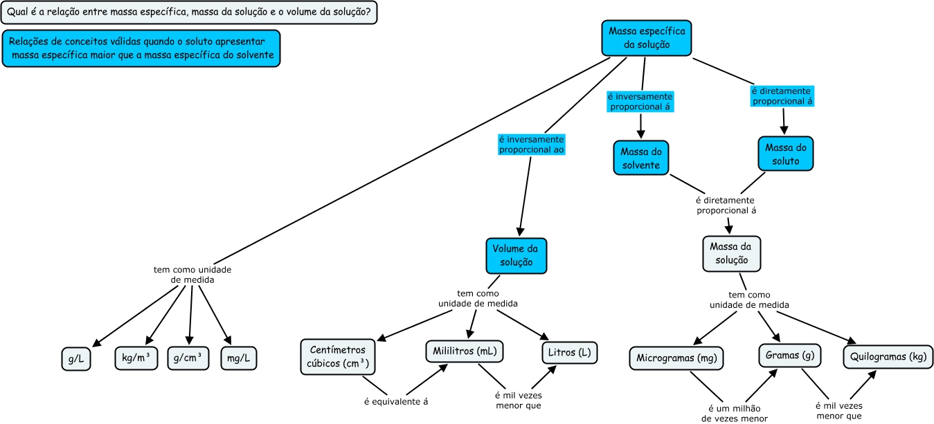 Esse mapa conceitual, produzido no IHMC CmapTools, tem a informação relacionada a: Massa específica 2ºB 2011, Massa específica da solução é inversamente proporcional ao Volume da solução, Massa específica da solução é diretamente proporcional á Massa do soluto, Massa específica da solução é inversamente proporcional á Massa do solvente, Massa do soluto é diretamente proporcional á Massa da solução, Massa da solução tem como unidade de medida Microgramas (mg), Gramas (g) é mil vezes menor que Quilogramas (kg), Volume da solução tem como unidade de medida Centímetros cúbicos (cm³), Centímetros cúbicos (cm³) é equivalente á Mililitros (mL), Massa específica da solução tem como unidade de medida g/L, Massa do solvente é diretamente proporcional á Massa da solução, Volume da solução tem como unidade de medida Mililitros (mL), Volume da solução tem como unidade de medida Litros (L), Mililitros (mL) é mil vezes menor que Litros (L), Massa específica da solução tem como unidade de medida mg/L, Massa específica da solução tem como unidade de medida g/cm³, Massa específica da solução tem como unidade de medida kg/m³, Massa da solução tem como unidade de medida Gramas (g), Massa da solução tem como unidade de medida Quilogramas (kg), Microgramas (mg) é um milhão de vezes menor Gramas (g)