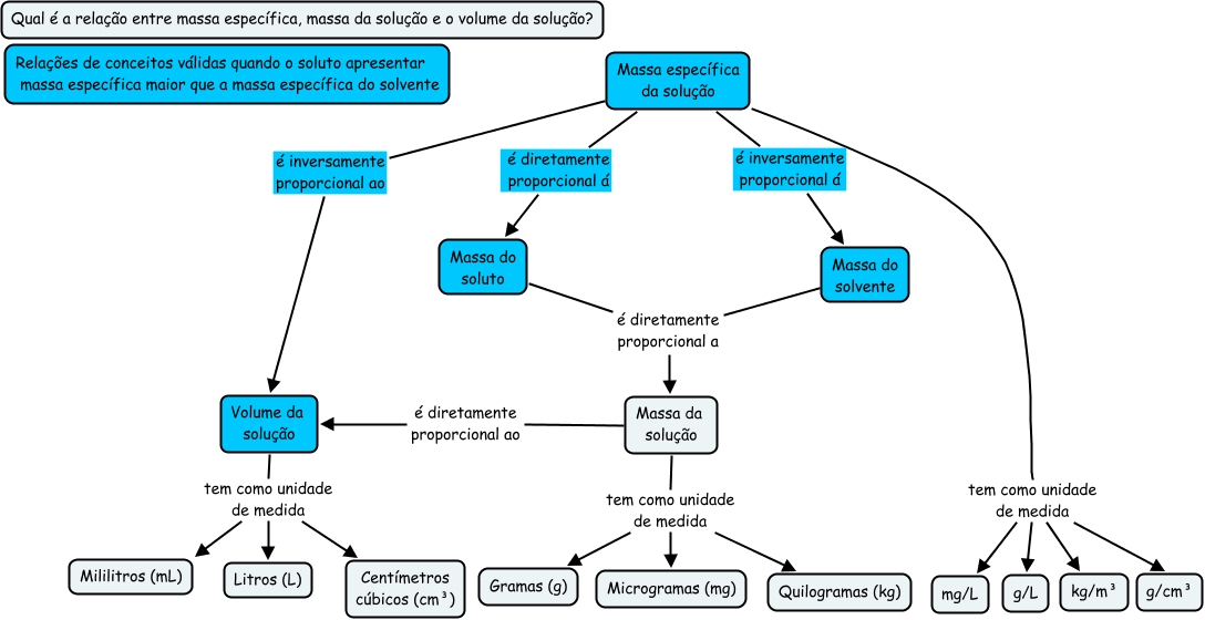 Esse mapa conceitual, produzido no IHMC CmapTools, tem a informação relacionada a: Massa específica 2ºD 2011, Massa específica da solução é diretamente proporcional á Massa do soluto, Massa do soluto é diretamente proporcional a Massa da solução, Massa do solvente é diretamente proporcional a Massa da solução, Massa específica da solução tem como unidade de medida mg/L, Massa específica da solução tem como unidade de medida g/L, Massa específica da solução tem como unidade de medida kg/m³, Massa da solução é diretamente proporcional ao Volume da solução, Volume da solução tem como unidade de medida Centímetros cúbicos (cm³), Volume da solução tem como unidade de medida Litros (L), Massa da solução tem como unidade de medida Microgramas (mg), Massa da solução tem como unidade de medida Gramas (g), Massa da solução tem como unidade de medida Quilogramas (kg), Volume da solução tem como unidade de medida Mililitros (mL), Massa específica da solução é inversamente proporcional ao Volume da solução, Massa específica da solução é inversamente proporcional á Massa do solvente, Massa específica da solução tem como unidade de medida g/cm³