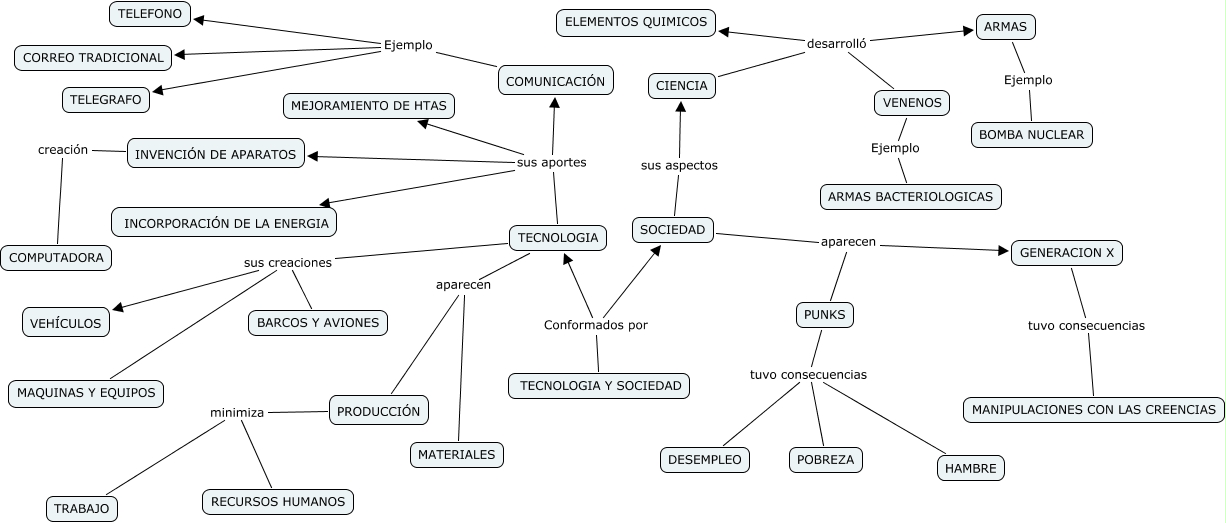 Este Cmap, tiene información relacionada con: Mariisol Andradee, SOCIEDAD aparecen PUNKS, ARMAS Ejemplo BOMBA NUCLEAR, COMUNICACIÓN Ejemplo CORREO TRADICIONAL, CIENCIA desarrolló ARMAS, CIENCIA desarrolló VENENOS, TECNOLOGIA sus aportes INVENCIÓN DE APARATOS, TECNOLOGIA sus aportes INCORPORACIÓN DE LA ENERGIA, CIENCIA desarrolló ELEMENTOS QUIMICOS, TECNOLOGIA sus creaciones MAQUINAS Y EQUIPOS, COMUNICACIÓN Ejemplo TELEFONO, GENERACION X tuvo consecuencias MANIPULACIONES CON LAS CREENCIAS, TECNOLOGIA Y SOCIEDAD Conformados por TECNOLOGIA, TECNOLOGIA sus aportes COMUNICACIÓN, INVENCIÓN DE APARATOS creación COMPUTADORA, VENENOS Ejemplo ARMAS BACTERIOLOGICAS, PUNKS tuvo consecuencias HAMBRE, TECNOLOGIA Y SOCIEDAD Conformados por SOCIEDAD, PUNKS tuvo consecuencias DESEMPLEO, SOCIEDAD aparecen GENERACION X, PRODUCCIÓN minimiza TRABAJO