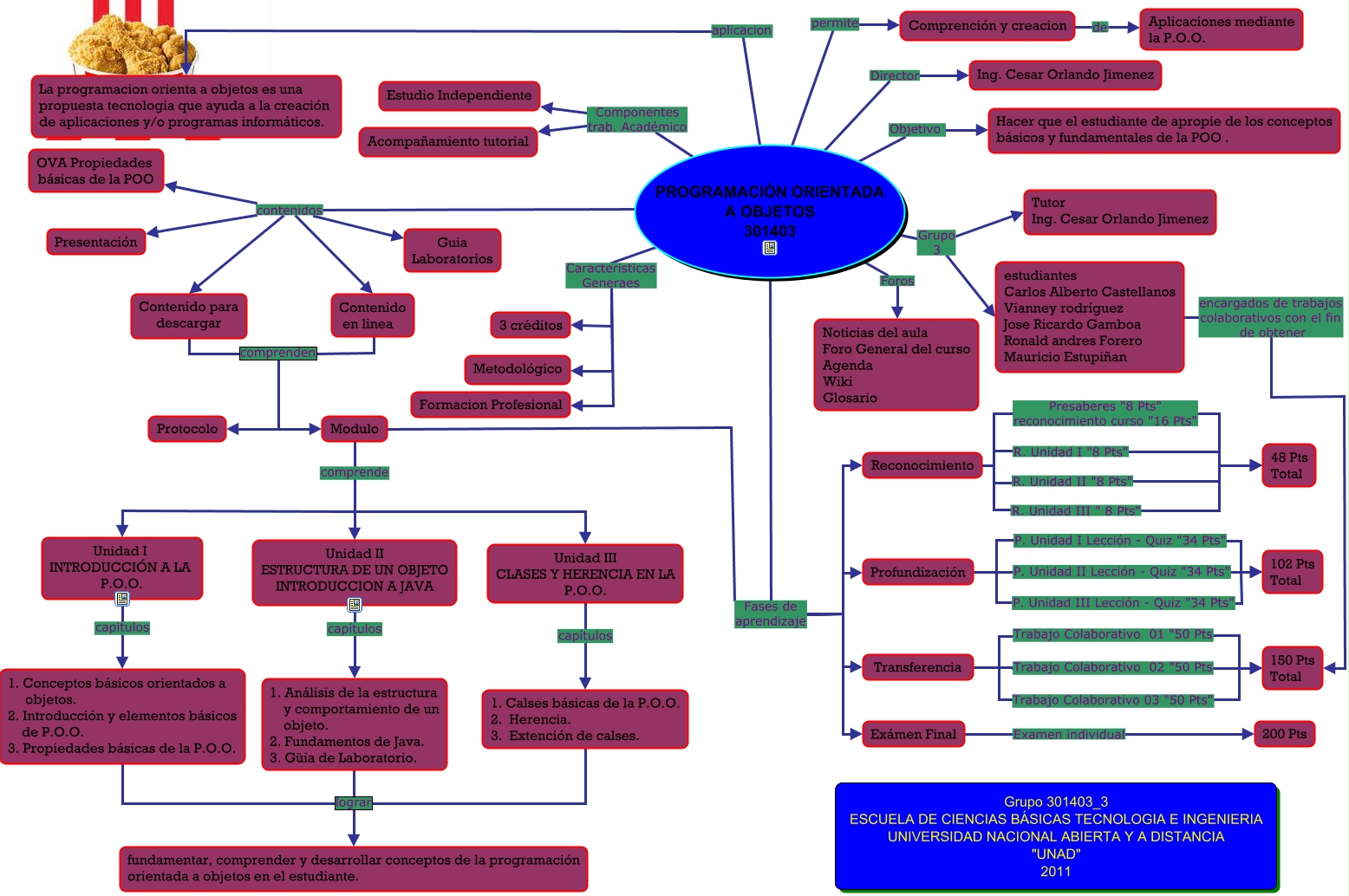 Este Cmap, tiene información relacionada con: POO, Contenido para descargar comprenden Modulo, PROGRAMACIÓN ORIENTADA A OBJETOS 301403 Caracteristicas Generaes 3 créditos, Reconocimiento R. Unidad III " 8 Pts" 48 Pts Total, PROGRAMACIÓN ORIENTADA A OBJETOS 301403 contenidos Contenido en linea, PROGRAMACIÓN ORIENTADA A OBJETOS 301403 Objetivo Hacer que el estudiante de apropie de los conceptos básicos y fundamentales de la POO ., Reconocimiento R. Unidad I "8 Pts" 48 Pts Total, PROGRAMACIÓN ORIENTADA A OBJETOS 301403 Fases de aprendizaje Transferencia, Contenido para descargar comprenden Protocolo, Modulo Fases de aprendizaje Transferencia, Transferencia Trabajo Colaborativo 03 "50 Pts" 150 Pts Total, PROGRAMACIÓN ORIENTADA A OBJETOS 301403 contenidos OVA Propiedades básicas de la POO, Contenido en linea comprenden Modulo, PROGRAMACIÓN ORIENTADA A OBJETOS 301403 Director Ing. Cesar Orlando Jimenez, PROGRAMACIÓN ORIENTADA A OBJETOS 301403 Caracteristicas Generaes Formacion Profesional, Exámen Final Examen individual 200 Pts, Modulo comprende Unidad III CLASES Y HERENCIA EN LA P.O.O., PROGRAMACIÓN ORIENTADA A OBJETOS 301403 Fases de aprendizaje Profundización, PROGRAMACIÓN ORIENTADA A OBJETOS 301403 Fases de aprendizaje Reconocimiento, PROGRAMACIÓN ORIENTADA A OBJETOS 301403 Grupo 3 estudiantes Carlos Alberto Castellanos Vianney rodríguez Jose Ricardo Gamboa Ronald andres Forero Mauricio Estupiñan, PROGRAMACIÓN ORIENTADA A OBJETOS 301403 contenidos Contenido para descargar