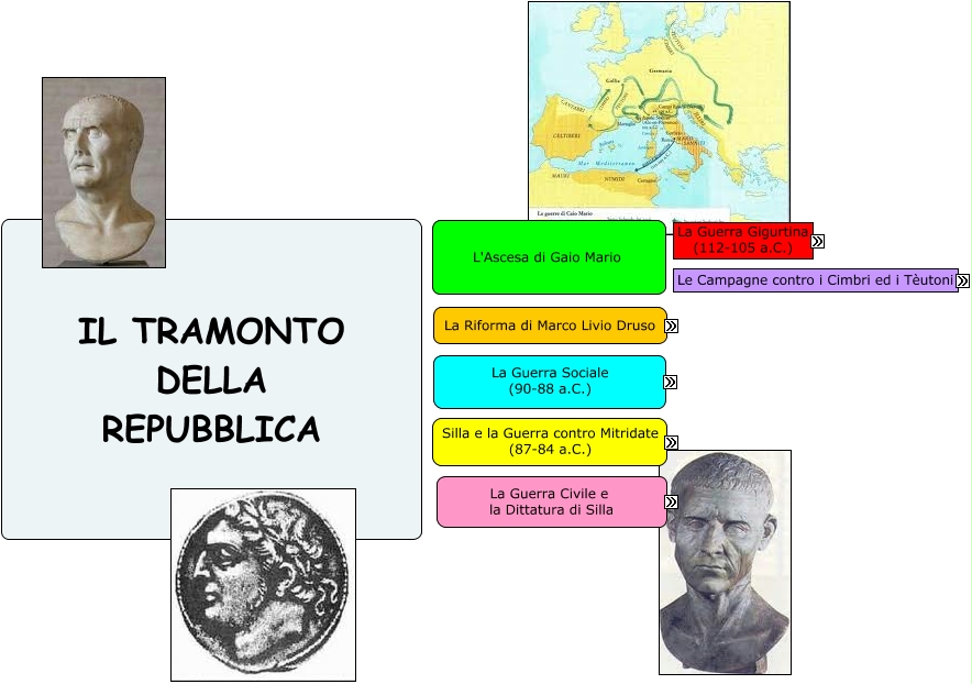 Questa Cmap, creata con IHMC CmapTools, contiene informazioni relative a: L'Impero Romano [Il Tramonto della Repubblica - Parte I] Manzoni, GUERRA GIGURTINA (112-105 a.C:) risolta, poi, dal: Console GAIO MARIO, alcune Riforme Tribunali affidati ai soli Senatori, Sconfisse MITRIDATE in seguito alla vittoria, nell'85 a.C., a: SINOPE, Nel 91 a.C. venne eletto tribuno della plebe.. MARCO LIVIO DRUSO, Console GAIO MARIO che attuò: Una Riforma dell'Esercito, RIFORMA Concessione della Cittadinanza, La Guerra Sociale (90-88 a.C.) da: Socii (Alleati), Una Riforma dell'Esercito Introduzione Soldo, Console GAIO MARIO eletto, dal popolo, nel: 107 a.C., MITRIDATE VI Eupàtore ed il comando della guerra fu affidato a: Lucio Cornelio SILLA, Alleati Italici che erano scontenti perchè: Non avevano mfunzioni di comando nell'esercito, una DITTATURA Che segnò la fine della: Guerra Civile, Un nuovo Scontro con: MITRIDATE VI Eupàtore, MARCO LIVIO DRUSO che fu promotore di una: RIFORMA, Una Riforma dell'Esercito Arruolamento Nullatenenti, Soffocare la Rivolta dei Populares e instaurò, in seguito alla vittoria di PORTACOLLINA (82 a.C.) una DITTATURA, Nel 90 a.C. la rivoltà dilago e scoppiò, tra i Romani e gli alleati,: La Guerra Sociale (90-88 a.C.), La Guerra Sociale (90-88 a.C.) che si concluse con: La Vittoria dei Romani, alcune Riforme Poteri Tribuni della Plebe notevolmente Ridotti, MITRIDATE VI Eupàtore RE DEL PONTO