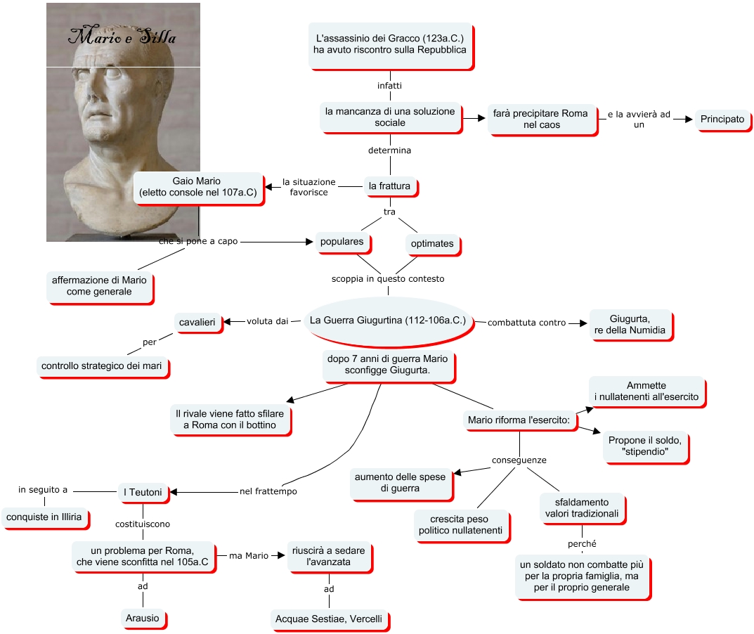 Questa Cmap, creata con IHMC CmapTools, contiene informazioni relative a: Mario & Silla - Prima Parte (Sonzogni), la mancanza di una soluzione sociale farà precipitare Roma nel caos, Gaio Mario (eletto console nel 107a.C) che si pone a capo affermazione di Mario come generale, riuscirà a sedare l'avanzata ad Acquae Sestiae, Vercelli, Gaio Mario (eletto console nel 107a.C) che si pone a capo populares, la frattura tra optimates, I Teutoni in seguito a conquiste in Illiria, Mario riforma l'esercito: ???? Ammette i nullatenenti all'esercito, Mario riforma l'esercito: conseguenze crescita peso politico nullatenenti, dopo 7 anni di guerra Mario sconfigge Giugurta. ???? Il rivale viene fatto sfilare a Roma con il bottino, cavalieri per controllo strategico dei mari, dopo 7 anni di guerra Mario sconfigge Giugurta. ???? Mario riforma l'esercito:, dopo 7 anni di guerra Mario sconfigge Giugurta. nel frattempo I Teutoni, la frattura la situazione favorisce Gaio Mario (eletto console nel 107a.C), Mario riforma l'esercito: ???? Propone il soldo, "stipendio", La Guerra Giugurtina (112-106a.C.) ???? dopo 7 anni di guerra Mario sconfigge Giugurta., I Teutoni costituiscono un problema per Roma, che viene sconfitta nel 105a.C, un problema per Roma, che viene sconfitta nel 105a.C ma Mario riuscirà a sedare l'avanzata, La Guerra Giugurtina (112-106a.C.) combattuta contro Giugurta, re della Numidia, La Guerra Giugurtina (112-106a.C.) voluta dai cavalieri, farà precipitare Roma nel caos e la avvierà ad un Principato