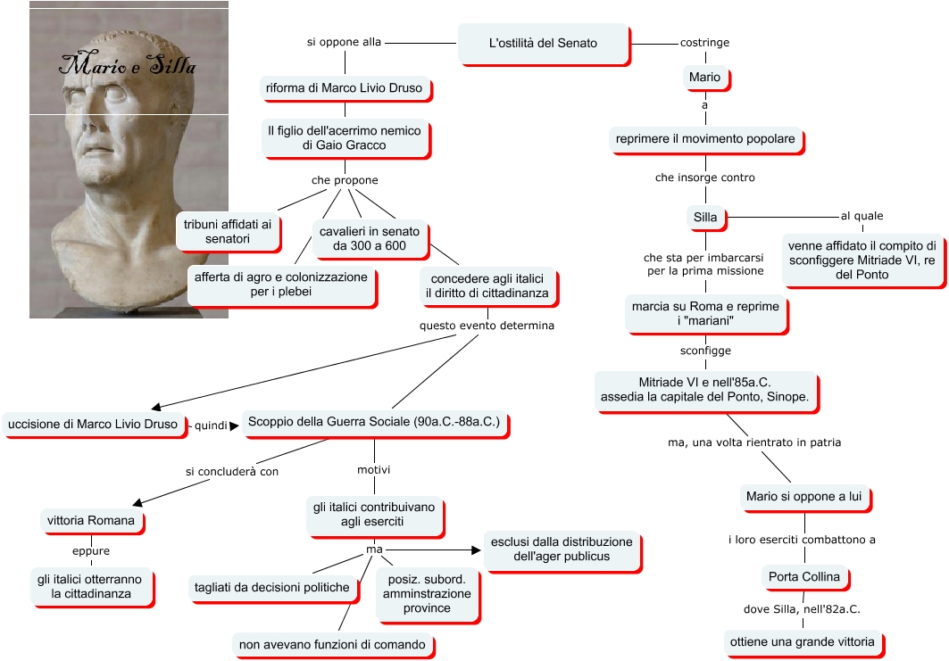 Questa Cmap, creata con IHMC CmapTools, contiene informazioni relative a: Mario & Silla - Seconda Parte (Sonzogni), Mitriade VI e nell'85a.C. assedia la capitale del Ponto, Sinope. ma, una volta rientrato in patria Mario si oppone a lui, reprimere il movimento popolare che insorge contro Silla, Il figlio dell'acerrimo nemico di Gaio Gracco che propone cavalieri in senato da 300 a 600, Il figlio dell'acerrimo nemico di Gaio Gracco che propone concedere agli italici il diritto di cittadinanza, riforma di Marco Livio Druso ???? Il figlio dell'acerrimo nemico di Gaio Gracco, gli italici contribuivano agli eserciti ma esclusi dalla distribuzione dell'ager publicus, Mario si oppone a lui i loro eserciti combattono a Porta Collina, marcia su Roma e reprime i "mariani" sconfigge Mitriade VI e nell'85a.C. assedia la capitale del Ponto, Sinope., Il figlio dell'acerrimo nemico di Gaio Gracco che propone afferta di agro e colonizzazione per i plebei, Mario a reprimere il movimento popolare, gli italici contribuivano agli eserciti ma tagliati da decisioni politiche, Silla che sta per imbarcarsi per la prima missione marcia su Roma e reprime i "mariani", Porta Collina dove Silla, nell'82a.C. ottiene una grande vittoria, L'ostilità del Senato si oppone alla riforma di Marco Livio Druso, concedere agli italici il diritto di cittadinanza questo evento determina uccisione di Marco Livio Druso, Silla al quale venne affidato il compito di sconfiggere Mitriade VI, re del Ponto, Scoppio della Guerra Sociale (90a.C.-88a.C.) motivi gli italici contribuivano agli eserciti, concedere agli italici il diritto di cittadinanza questo evento determina Scoppio della Guerra Sociale (90a.C.-88a.C.), Il figlio dell'acerrimo nemico di Gaio Gracco che propone tribuni affidati ai senatori, vittoria Romana eppure gli italici otterranno la cittadinanza