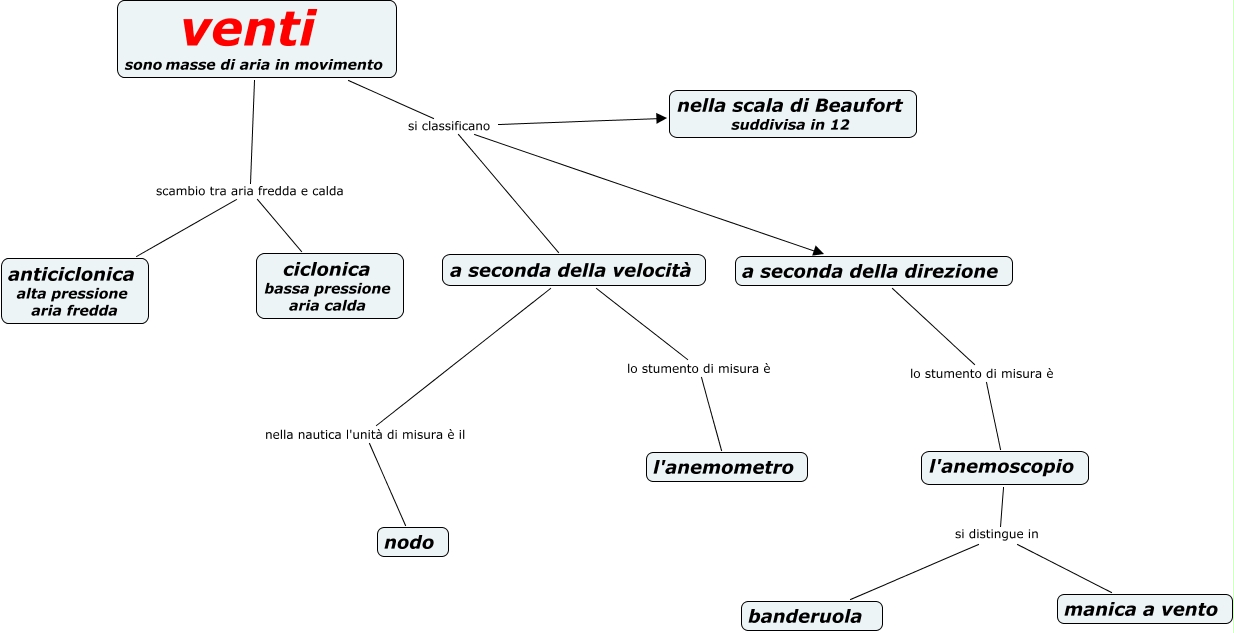 Questa Cmap, creata con IHMC CmapTools, contiene informazioni relative a: venti CORRADO, venti sonomasse di aria in movimento si classificano a seconda della velocità, venti sonomasse di aria in movimento scambio tra aria fredda e calda anticiclonica alta pressione aria fredda, venti sonomasse di aria in movimento si classificano nella scala di Beaufort suddivisa in 12, a seconda della velocità nella nautica l'unità di misura è il nodo, a seconda della velocità lo stumento di misura è l'anemometro, l'anemoscopio si distingue in manica a vento, l'anemoscopio si distingue in banderuola, a seconda della direzione lo stumento di misura è l'anemoscopio, venti sonomasse di aria in movimento si classificano a seconda della direzione, venti sonomasse di aria in movimento scambio tra aria fredda e calda ciclonica bassa pressione aria calda