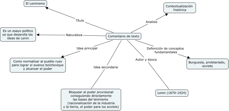 Este Cmap, tiene información relacionada con: Comentario, Comentario de texto Idea secundaria Bloquear al poder provisional consiguiendo directamente las bases del leninismo (nacionalización de la industria y la tierra, el poder para los soviets), Comentario de texto Naturaleza Es un esayo político ya que desarolla las ideas de Lenin, Comentario de texto Analisis Contextualización histórica, Comentario de texto Idea principal Como normalizar al pueblo ruso para lograr el avance bolchevique y alcanzar el poder, Comentario de texto Título El Leninismo, Comentario de texto Autor y época Lenin (1870-1924), Comentario de texto Defenición de conceptos fundamentales Burguesía, proletariado, soviets