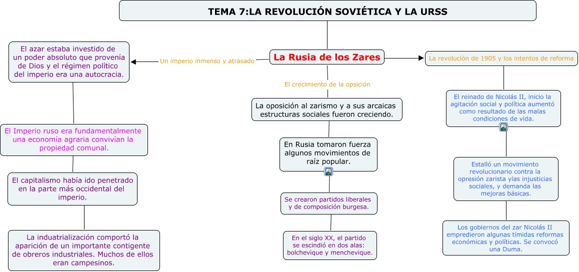 Este Cmap, tiene información relacionada con: punto 1, El Imperio ruso era fundamentalmente una economía agraria convivían la propiedad comunal. ???? El capitalismo había ido penetrado en la parte más occidental del imperio., El azar estaba investido de un poder absoluto que provenía de Dios y el régimen político del imperio era una autocracia. ???? El Imperio ruso era fundamentalmente una economía agraria convivían la propiedad comunal., El reinado de Nicolás II, inicio la agitación social y política aumentó como resultado de las malas condiciones de vida. ???? Estalló un movimiento revolucionario contra la opresión zarista ylas injusticias sociales, y demanda las mejoras básicas., Se crearon partidos liberales y de composición burgesa. ???? En el siglo XX, el partido se escindió en dos alas: bolchevique y menchevique., TEMA 7:LA REVOLUCIÓN SOVIÉTICA Y LA URSS ???? La Rusia de los Zares, Estalló un movimiento revolucionario contra la opresión zarista ylas injusticias sociales, y demanda las mejoras básicas. ???? Los gobiernos del zar Nicolás II empredieron algunas tímidas reformas económicas y políticas. Se convocó una Duma., La Rusia de los Zares ???? La revolución de 1905 y los intentos de reforma, En Rusia tomaron fuerza algunos movimientos de raíz popular. ???? Se crearon partidos liberales y de composición burgesa., La Rusia de los Zares El crecimiento de la opsición La oposición al zarismo y a sus arcaicas estructuras sociales fueron creciendo., El capitalismo había ido penetrado en la parte más occidental del imperio. ???? La induatrialización comportó la aparición de un importante contigente de obreros industriales. Muchos de ellos eran campesinos., La oposición al zarismo y a sus arcaicas estructuras sociales fueron creciendo. ???? En Rusia tomaron fuerza algunos movimientos de raíz popular., La revolución de 1905 y los intentos de reforma ???? El reinado de Nicolás II, inicio la agitación social y política aumentó como resultado de las malas condiciones de vida., La Rusia de los Zares Un imperio inmenso y atrasado El azar estaba investido de un poder absoluto que provenía de Dios y el régimen político del imperio era una autocracia.