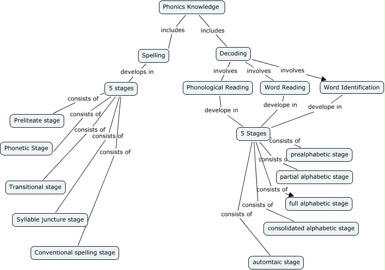 This Concept Map, created with IHMC CmapTools, has information related to: Phonics, Word Identification develope in 5 Stages, 5 stages consists of Transitional stage, 5 stages consists of Phonetic Stage, 5 Stages consists of consolidated alphabetic stage, 5 Stages consists of prealphabetic stage, 5 Stages consists of partial alphabetic stage, Phonics Knowledge includes Spelling, Decoding involves Word Identification, Phonological Reading develope in 5 Stages, Spelling develops in 5 stages, 5 Stages consists of automtaic stage, Decoding involves Phonological Reading, Decoding involves Word Reading, Word Reading develope in 5 Stages, Phonics Knowledge includes Decoding, 5 stages consists of Conventional spelling stage, 5 Stages consists of full alphabetic stage, 5 stages consists of Preliteate stage, 5 stages consists of Syllable juncture stage
