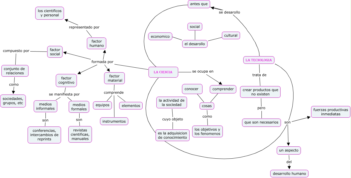 Este Cmap, tiene información relacionada con: la ciencia y la tecnologia-CESIA JURADO, LA CIENCIA formada por factor humano, LA TECNOLOGIA se desarollo antes que, LA CIENCIA se ocupa en comprender, medios formales son revistas cientificas, manuales, factor material comprende elementos, la actividad de la sociedad cuyo objeto es la adquisicion de conocimiento, LA CIENCIA formada por factor social, el desarollo ???? cultural, LA TECNOLOGIA son un aspecto, cosas como los objetivos y los fenomenos, el desarollo ???? social, LA CIENCIA formada por factor cognitivo, factor material comprende equipos, comprender ???? cosas, el desarollo ???? economico, factor social compuesto por conjunto de relaciones, crear productos que no existen pero que son necesarios, LA TECNOLOGIA trata de crear productos que no existen, factor cognitivo se manifiesta por medios informales, LA TECNOLOGIA son fuerzas productivas inmediatas