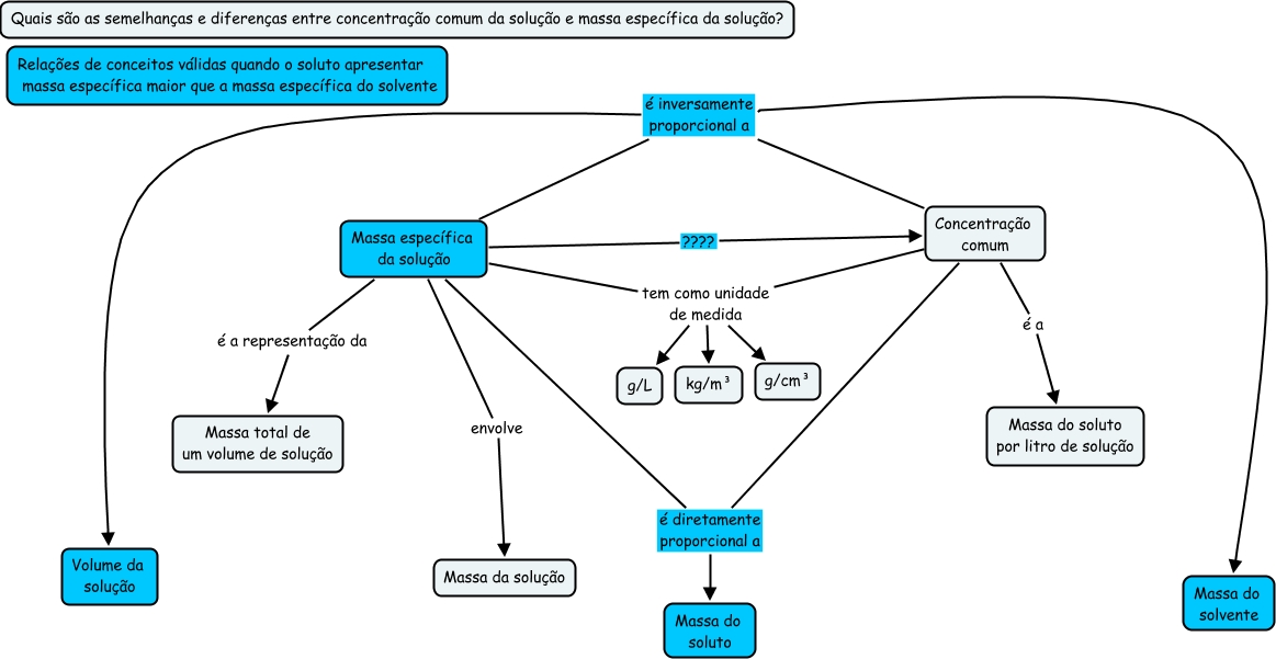 Esse mapa conceitual, produzido no IHMC CmapTools, tem a informação relacionada a: Concentração e massa específica 2D 2011, Concentração comum tem como unidade de medida g/cm³, Massa específica da solução ???? Concentração comum, Massa específica da solução envolve Massa da solução, Massa específica da solução tem como unidade de medida g/L, Concentração comum tem como unidade de medida g/L, Concentração comum é inversamente proporcional a Massa do solvente, Concentração comum é inversamente proporcional a Volume da solução, Concentração comum tem como unidade de medida kg/m³, Concentração comum é a Massa do soluto por litro de solução, Massa específica da solução é diretamente proporcional a Massa do soluto, Massa específica da solução é inversamente proporcional a Massa do solvente, Massa específica da solução tem como unidade de medida g/cm³, Massa específica da solução é inversamente proporcional a Volume da solução, Massa específica da solução é a representação da Massa total de um volume de solução, Concentração comum é diretamente proporcional a Massa do soluto, Massa específica da solução tem como unidade de medida kg/m³