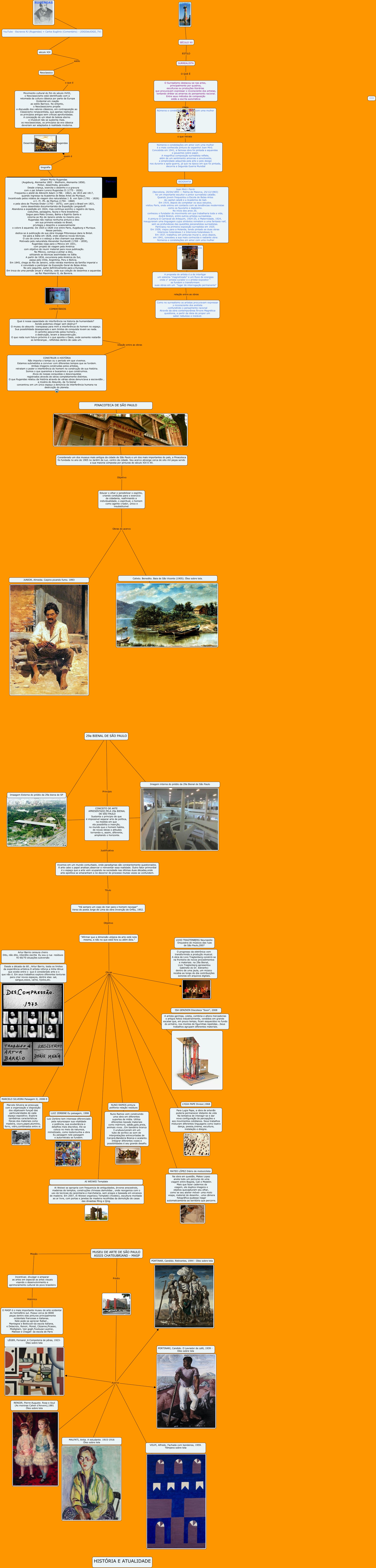 Esse mapa conceitual, produzido no IHMC CmapTools, tem a informação relacionada a: Bienal Sao Paulo reestruturado.cmap, "Há sempre um copo de mar para o homem navegar" Verso do poeta Jorge de Lima da obra Invenção de Orfeu, 1952. Objetivo "Afirmar que a dimensão utópica da arte está nela mesma, e não no que está fora ou além dela.", BIOGRAFIA ???? Joan Miró i Ferrà (Barcelona, 20/04/1893 — Palma de Maiorca, 25/12/1983) foi um importante escultor e pintor surrealista catalão. Quando jovem frequentou a Escola de Belas-Artes da capital catalã e a Academia de Gali. Em 1919, depois de completar os seus estudos, visitou Paris, onde entrou em contacto com as tendências modernistas como os fauvismo e dadaísmo. No início dos anos 20, conheceu o fundador do movimento em que trabalharia toda a vida, André Breton, entre outros artistas surrealistas. A pintura O Carnaval de Arlequim, 1924-25, e Maternidade, 1924, inauguraram uma linguagem cujos símbolos remetem a uma fantasia naif, sem as profundezas das questões psicanalistas surrealistas. Participou na primeira exposição surrealista em 1925. Em 1928, viajou para a Holanda, tendo pintado as duas obras Interiores holandeses I e Interiores holandeses II. Em 1937, trabalhou em pinturas-mural e, anos depois, em 1941, concebeu a sua mais conhecida e radiante obra: Números e constelações em amor com uma mulher, Acervo, Números e constelações em amor com uma mulher o que retrata Números e constelações em amor com uma mulher é a mais conhecida pintura do espanhol Joan Miró. Concebida em 1941, a famosa obra foi pintada a aquarelas e gouaches sobre papel. A magnífica composição surrealista reflete, além de um sentimento amoroso e envolvente, a simplicidade adquirida pela arte e pelo design nos durante e após-guerra, já que na época em que foi pintada, decorria a Segunda Guerra Mundial, ABSURDO COMENTÁRIOS Qual é nossa capacidade de interferência na historia da humanidade? Aonde podemos chegar sem destruir? O museu do absurdo transpassa para mim a interferência do homem no espaço. Sua possibilidade desesperada e sem limites de conquista levam ao nada. O caminho pescorrido pelos homens , a destruição, levam a desconstrução. O que resta num futuro próximo é o que aponta o Oasis, onde somente restarão as lembranças , refletidas dentro de cada um., SURREALISTA O QUE É O Surrealismo destacou-se nas artes, principalmente por quadros, esculturas ou produções literárias que procuravam expressar o inconsciente dos artistas, tentando driblar as amarras do pensamento racional. Entre seus métodos de composição estão a escrita automática, Joan Miró i Ferrà (Barcelona, 20/04/1893 — Palma de Maiorca, 25/12/1983) foi um importante escultor e pintor surrealista catalão. Quando jovem frequentou a Escola de Belas-Artes da capital catalã e a Academia de Gali. Em 1919, depois de completar os seus estudos, visitou Paris, onde entrou em contacto com as tendências modernistas como os fauvismo e dadaísmo. No início dos anos 20, conheceu o fundador do movimento em que trabalharia toda a vida, André Breton, entre outros artistas surrealistas. A pintura O Carnaval de Arlequim, 1924-25, e Maternidade, 1924, inauguraram uma linguagem cujos símbolos remetem a uma fantasia naif, sem as profundezas das questões psicanalistas surrealistas. Participou na primeira exposição surrealista em 1925. Em 1928, viajou para a Holanda, tendo pintado as duas obras Interiores holandeses I e Interiores holandeses II. Em 1937, trabalhou em pinturas-mural e, anos depois, em 1941, concebeu a sua mais conhecida e radiante obra: Números e constelações em amor com uma mulher ???? ÁRVORE MAGNÉTICA, ???? ???? ????, biografia ???? Johann Moritz Rugendas (Augsburg, Alemanha 1802 - Weilheim, Alemanha 1858). Pintor, desenhista, gravador. Desde criança, exercita o desenho e a gravura com o pai Johann Lorenz Rugendas II (1775 - 1826). Freqüenta o ateliê de Albrecht Adam (1786 - 1862), de 1815 até 1817, quando ingressa na Academia de Belas Artes de Munique. Incentivado pelos relatos de viagem dos naturalistas J. B. von Spix (1781 - 1826) e C. Fr. Ph. de Martius (1794 - 1868) e pela obra de Thomas Ender (1793 - 1875), vem para o Brasil em 1821, como desenhista documentarista da Expedição Langsdorff. Abandona a expedição em 1824, mas continua sozinho o registro de tipos, costumes, paisagens, fauna e flora brasileiros. Segue para Mato Grosso, Bahia e Espírito Santo e retorna ao Rio de Janeiro ainda no mesmo ano. Rugendas não realiza nenhuma pintura a óleo em sua primeira estada no Brasil, privilegia o desenho e ocasionalmente o colore à aquarela. De 1825 a 1828 vive entre Paris, Augsburg e Munique. Nesse período, dedica-se à publicação de sua obra Voyage Pittoresque dans le Brésil. Vai para a Itália em 1828, onde observa novas técnicas. O uso de cores e o esboço a óleo chamam sua atenção. Motivado pelo naturalista Alexander Humboldt (1769 - 1859), Rugendas viaja para o México em 1831, com projeto de viagem pela América com objetivo de reunir material para nova publicação. No México, começa a pintar a óleo, utilizando as técnicas assimiladas na Itália. A partir de 1834, excursiona pela América do Sul, passa pelo Chile, Argentina, Peru e Bolívia. Em 1845, chega ao Rio de Janeiro, onde retrata membros da família imperial e é convidado a participar da Exposição Geral de Belas Artes. No ano seguinte, parte definitivamente para a Europa. Em troca de uma pensão anual e vitalícia, cede sua coleção de desenhos e aquarelas ao Rei Maximiliano II, da Baviera., "Afirmar que a dimensão utópica da arte está nela mesma, e não no que está fora ou além dela." Obras, O Surrealismo destacou-se nas artes, principalmente por quadros, esculturas ou produções literárias que procuravam expressar o inconsciente dos artistas, tentando driblar as amarras do pensamento racional. Entre seus métodos de composição estão 