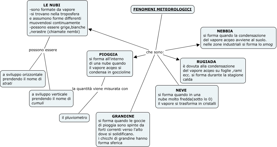 Questa Cmap, creata con IHMC CmapTools, contiene informazioni relative a: fenomeni meteorologici, FENOMENI METEOROLOGICI che sono: NEBBIA si forma quando la condensazione del vapore acqeo avviene al suolo. nelle zone industriali si forma lo smog, FENOMENI METEOROLOGICI che sono: GRANDINE si forma quando le goccie di pioggia sono spinte da forti correnti verso l'alto dove si solidificano. i chicchi di grandine hanno forma sferica, LE NUBI -sono formate da vapore -si trovano nella troposfera e assumono forme differenti muovendosi continuamente -possono essere grige,bianche ,nerastre (chiamate nembi) possono essere a sviluppo verticale prendendo il nome di cumuli, FENOMENI METEOROLOGICI che sono: RUGIADA è dovuta alla condensazione del vapore acqeo su foglie ,rami ecc. si forma durante la stagione calda, LE NUBI -sono formate da vapore -si trovano nella troposfera e assumono forme differenti muovendosi continuamente -possono essere grige,bianche ,nerastre (chiamate nembi) possono essere a sviluppo orizzontale prendendo il nome di strati, FENOMENI METEOROLOGICI che sono: PIOGGIA si forma all'interno di una nube quando il vapore acqeo si condensa in goccioline, PIOGGIA si forma all'interno di una nube quando il vapore acqeo si condensa in goccioline la quantità viene misurata con il pluviometro, FENOMENI METEOROLOGICI che sono: LE NUBI -sono formate da vapore -si trovano nella troposfera e assumono forme differenti muovendosi continuamente -possono essere grige,bianche ,nerastre (chiamate nembi), FENOMENI METEOROLOGICI che sono: NEVE si forma quando in una nube molto fredda(sotto lo 0) il vapore si trasforma in cristalli