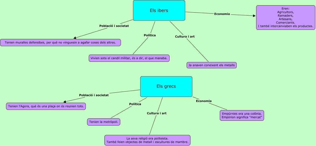Este Cmap, tiene información relacionada con: Medi2, Els grecs Cultura i art La seva religió era politeista. També feien objectes de metall i escultures de mambre., Els grecs Població i societat Tenien l'Agora, què és una plaça on és reunien tots., Els grecs Política Tenien la metròpoli., Els ibers Economia Eren: Agricultors, Ramaders, Artesans, Comerciants. I també intercanviaben els productes., Els grecs Economia Empúrnies era una colònia. Empòrion significa "mercat", Els ibers Cultura i art Ja anaven coneixent els metalls, Els ibers Població i societat Tenien muralles defensibes, per què no vinguesin a agafar coses dels altres., Els ibers Política Vivien sota el candil militar, és a dir, el que manaba.