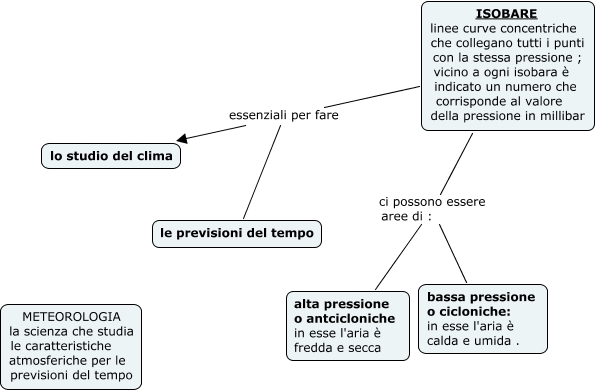 Questa Cmap, creata con IHMC CmapTools, contiene informazioni relative a: boh, ISOBARE linee curve concentriche che collegano tutti i punti con la stessa pressione ; vicino a ogni isobara è indicato un numero che corrisponde al valore della pressione in millibar essenziali per fare le previsioni del tempo, ISOBARE linee curve concentriche che collegano tutti i punti con la stessa pressione ; vicino a ogni isobara è indicato un numero che corrisponde al valore della pressione in millibar ci possono essere aree di : alta pressione o antcicloniche in esse l'aria è fredda e secca, ISOBARE linee curve concentriche che collegano tutti i punti con la stessa pressione ; vicino a ogni isobara è indicato un numero che corrisponde al valore della pressione in millibar ci possono essere aree di : bassa pressione o cicloniche: in esse l'aria è calda e umida ., ISOBARE linee curve concentriche che collegano tutti i punti con la stessa pressione ; vicino a ogni isobara è indicato un numero che corrisponde al valore della pressione in millibar essenziali per fare lo studio del clima