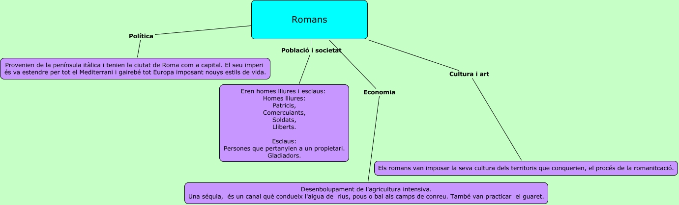 Este Cmap, tiene información relacionada con: Medi3, Romans Economia Desenbolupament de l'agricultura intensiva. Una séquia, és un canal què condueix l'aigua de rius, pous o bal als camps de conreu. També van practicar el guaret., Romans Cultura i art Els romans van imposar la seva cultura dels territoris que conquerien, el procés de la romanitcació., Romans Política Provenien de la península itàlica i tenien la ciutat de Roma com a capital. El seu imperi és va estendre per tot el Mediterrani i gairebé tot Europa imposant nouys estils de vida., Romans Població i societat Eren homes lliures i esclaus: Homes lliures: Patricis, Comercuiants, Soldats, Lliberts. Esclaus: Persones que pertanyien a un propietari. Gladiadors.