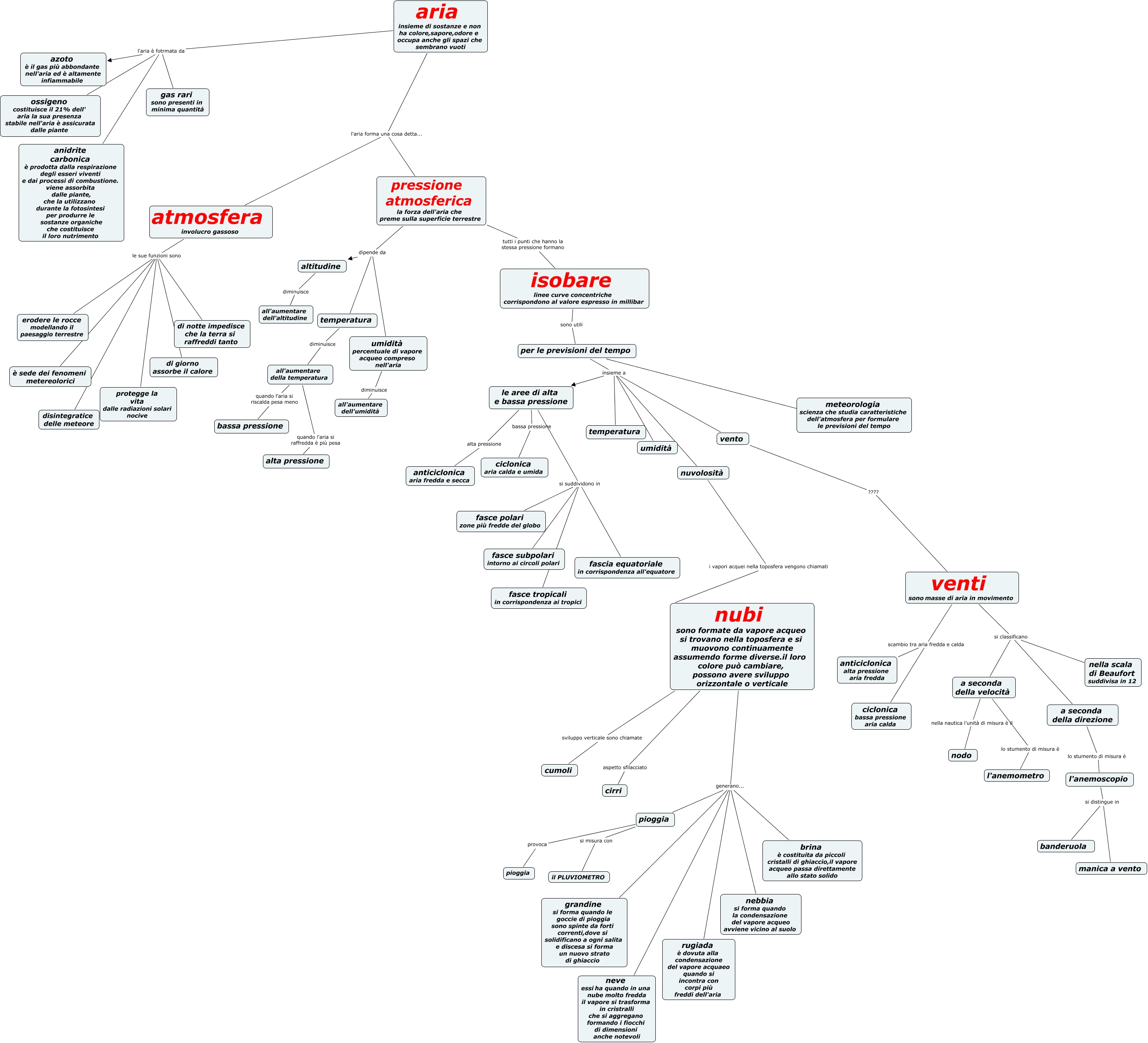 Questa Cmap, creata con IHMC CmapTools, contiene informazioni relative a: mappa capitolo, atmosfera involucro gassoso le sue funzioni sono di giorno assorbe il calore, nubi sono formate da vapore acqueo si trovano nella toposfera e si muovono continuamente assumendo forme diverse.il loro colore può cambiare, possono avere sviluppo orizzontale o verticale generano... rugiada è dovuta alla condensazione del vapore acquaeo quando si incontra con corpi più freddi dell'aria, aria insieme di sostanze e non ha colore,sapore,odore e occupa anche gli spazi che sembrano vuoti l'aria è fotrmata da anidrite carbonica è prodotta dalla respirazione degli esseri viventi e dai processi di combustione. viene assorbita dalle piante, che la utilizzano durante la fotosintesi per produrre le sostanze organiche che costituisce il loro nutrimento, all'aumentare della temperatura quando l'aria si riscalda pesa meno bassa pressione, atmosfera involucro gassoso le sue funzioni sono è sede dei fenomeni metereolorici, aria insieme di sostanze e non ha colore,sapore,odore e occupa anche gli spazi che sembrano vuoti l'aria è fotrmata da ossigeno costituisce il 21% dell' aria la sua presenza stabile nell'aria è assicurata dalle piante, per le previsioni del tempo insieme a le aree di alta e bassa pressione, nubi sono formate da vapore acqueo si trovano nella toposfera e si muovono continuamente assumendo forme diverse.il loro colore può cambiare, possono avere sviluppo orizzontale o verticale generano... brina è costituita da piccoli cristalli di ghiaccio,il vapore acqueo passa direttamente allo stato solido, nubi sono formate da vapore acqueo si trovano nella toposfera e si muovono continuamente assumendo forme diverse.il loro colore può cambiare, possono avere sviluppo orizzontale o verticale generano... pioggia, nubi sono formate da vapore acqueo si trovano nella toposfera e si muovono continuamente assumendo forme diverse.il loro colore può cambiare, possono avere sviluppo orizzontale o verticale generano... neve essiha quando in una nube molto fredda il vapore si trasforma in cristralli che si aggregano formando i fiocchi di dimensioni anche notevoli, a seconda della direzione lo stumento di misura è l'anemoscopio, isobare linee curve concentriche corrispondono al valore espresso in millibar sono utili per le previsioni del tempo, vento ???? venti sonomasse di aria in movimento, atmosfera involucro gassoso le sue funzioni sono di notte impedisce che la terra si raffreddi tanto, venti sonomasse di aria in movimento scambio tra aria fredda e calda ciclonica bassa pressione aria calda, le aree di alta e bassa pressione si suddividono in fascia equatoriale in corrispondenza all'equatore, nubi sono formate da vapore acqueo si trovano nella toposfera e si muovono continuamente assumendo forme diverse.il loro colore può cambiare, possono avere sviluppo orizzontale o verticale generano... nebbia si forma quando la condensazione del vapore acqueo avviene vicino al suolo, per le previsioni del tempo insieme a umidità, aria insieme di sostanze e non ha colore,sapore,odore e occupa anche gli spazi che sembrano vuoti l'aria forma una cosa detta... atmosfera involucro gassoso, l'anemoscopio si distingue in banderuola