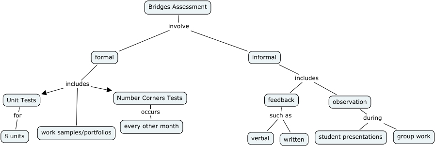 This Concept Map, created with IHMC CmapTools, has information related to: Bridges Assessment, formal includes work samples/portfolios, feedback such as written, Bridges Assessment involve informal, informal includes feedback, formal includes Unit Tests, observation during group work, Bridges Assessment involve formal, informal includes observation, Number Corners Tests occurs every other month, feedback such as verbal, observation during student presentations, formal includes Number Corners Tests, Unit Tests for 8 units