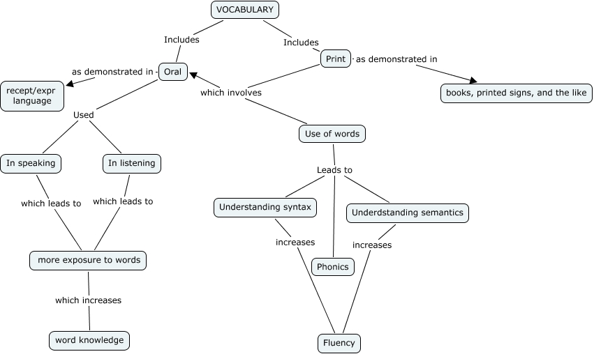 This Concept Map, created with IHMC CmapTools, has information related to: ERyan, VocabCmap, Use of words Leads to Phonics, VOCABULARY Includes Print, In listening which leads to more exposure to words, Underdstanding semantics increases Fluency, Print as demonstrated in books, printed signs, and the like, Oral Used In speaking, In speaking which leads to more exposure to words, Understanding syntax increases Fluency, VOCABULARY Includes Oral, Print which involves Use of words, Use of words Leads to Understanding syntax, Oral as demonstrated in recept/expr language, more exposure to words which increases word knowledge, Print which involves Oral, Use of words Leads to Underdstanding semantics, Oral Used In listening