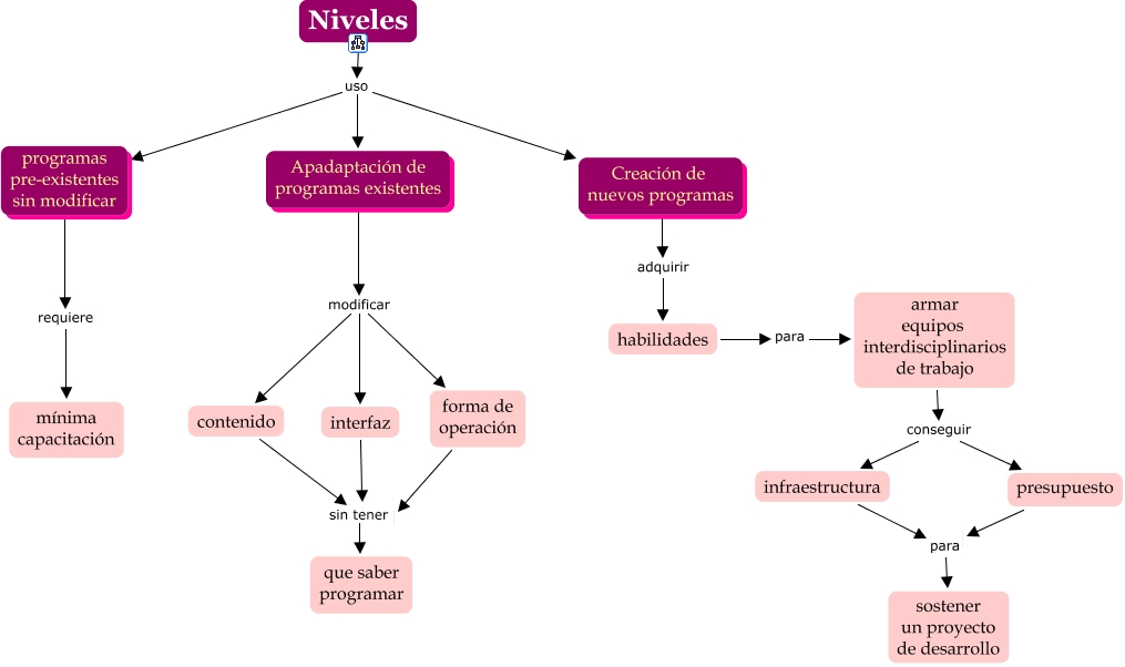 Este Cmap, tiene información relacionada con: 6_niveles, Apadaptación de programas existentes modificar interfaz, Creación de nuevos programas adquirir habilidades, Niveles uso programas pre-existentes sin modificar, interfaz, Apadaptación de programas existentes modificar forma de operación, presupuesto, habilidades para armar equipos interdisciplinarios de trabajo, Apadaptación de programas existentes modificar contenido, Niveles uso Apadaptación de programas existentes, forma de operación, armar equipos interdisciplinarios de trabajo conseguir presupuesto, infraestructura para sostener un proyecto de desarrollo, armar equipos interdisciplinarios de trabajo conseguir infraestructura, contenido sin tener que saber programar, Niveles uso Creación de nuevos programas, programas pre-existentes sin modificar requiere mínima capacitación