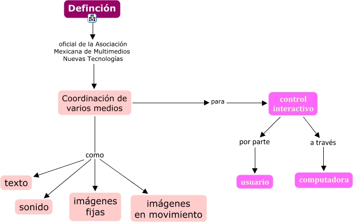 Este Cmap, tiene información relacionada con: 3_definicion, Coordinación de varios medios como texto, Coordinación de varios medios como sonido, control interactivo por parte usuario, Coordinación de varios medios para control interactivo, control interactivo a través computadora, Coordinación de varios medios como imágenes en movimiento, Definción oficial de la Asociación Mexicana de Multimedios Nuevas Tecnologías Coordinación de varios medios, Coordinación de varios medios como imágenes fijas
