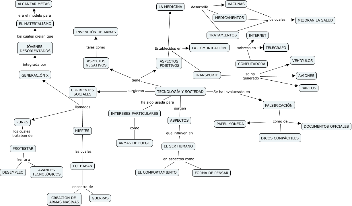 Este Cmap, tiene información relacionada con: JAIRO, LUCHABAN encontra de CREACIÓN DE ARMAS MASIVAS, EL MATERIALISMO era el modelo para ALCANZAR METAS, TECNOLOGÍA Y SOCIEDAD surgieron CORRIENTES SOCIALES, CORRIENTES SOCIALES llamadas HIPPIES, ASPECTOS que influyen en EL SER HUMANO, ASPECTOS POSITIVOS Establecidos en LA MEDICINA, TECNOLOGÍA Y SOCIEDAD surgen ASPECTOS, TECNOLOGÍA Y SOCIEDAD ha sido usada pàra INTERESES PARTICULARES, LA COMUNICACIÒN sobresalen TELÈGRAFO, PROTESTAR frente a AVANCES TECNOLÓGICOS, CORRIENTES SOCIALES llamadas PUNKS, HIPPIES las cuales LUCHABAN, FALSIFICACIÒN como de PAPEL MONEDA, TRATAMIENTOS los cuales MEJORAN LA SALUD, EL SER HUMANO en aspectos como FORMA DE PENSAR, FALSIFICACIÒN como de DICOS COMPÀCTILES, LA MEDICINA desarrollò MEDICAMENTOS, LUCHABAN encontra de GUERRAS, TECNOLOGÍA Y SOCIEDAD tiene ASPECTOS NEGATIVOS, ASPECTOS NEGATIVOS tales como INVENCIÒN DE ARMAS