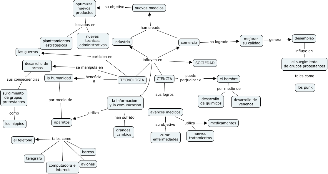 Este Cmap, tiene información relacionada con: tecnologia (Anderson Ordoñez), la informacion y la comunicacion han sufrido grandes cambios, optimizar nuevos productos basados en planteamientos estrategicos, comercio ha logrado mejorar su calidad, TECNOLOGIA influyen en la informacion y la comunicacion, avances medicos utiliza medicamentos, el hombre por medio de desarrollo de quimicos, el hombre por medio de desarrollo de venenos, mejorar su calidad genera desempleo, TECNOLOGIA se manipula en desarrollo de armas, surgimiento de grupos protestantes como los hippies, CIENCIA sus logros avances medicos, avances medicos su objetivo curar enfermedades, desarrollo de armas sus consecuencias surgimiento de grupos protestantes, TECNOLOGIA participa en las guerras, optimizar nuevos productos basados en nuevas tecnicas administrativas, TECNOLOGIA influyen en SOCIEDAD, aparatos tales como telegrafo, la informacion y la comunicacion utiliza aparatos, desempleo influye en el suegimiento de grupos protestantes, la humanidad por medio de aparatos