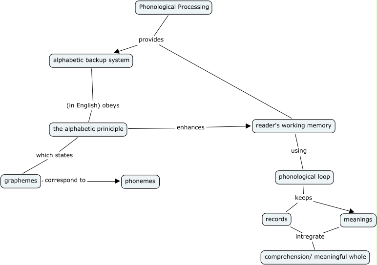 This Concept Map, created with IHMC CmapTools, has information related to: Phonological Processing, Phonological Processing provides reader's working memory, the alphabetic priniciple which states graphemes, records intregrate comprehension/ meaningful whole, phonological loop keeps meanings, phonological loop keeps records, the alphabetic priniciple enhances reader's working memory, meanings intregrate comprehension/ meaningful whole, graphemes correspond to phonemes, reader's working memory using phonological loop, alphabetic backup system (in English) obeys the alphabetic priniciple, Phonological Processing provides alphabetic backup system
