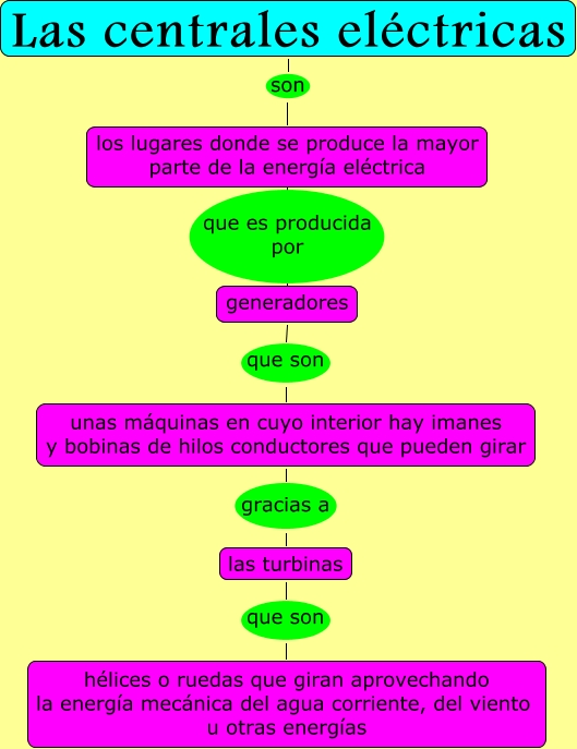 Este Cmap, tiene información relacionada con: Las centrales eléctricas, Las centrales eléctricas son los lugares donde se produce la mayor parte de la energía eléctrica, las turbinas que son hélices o ruedas que giran aprovechando la energía mecánica del agua corriente, del viento u otras energías, generadores que son unas máquinas en cuyo interior hay imanes y bobinas de hilos conductores que pueden girar, unas máquinas en cuyo interior hay imanes y bobinas de hilos conductores que pueden girar gracias a las turbinas, los lugares donde se produce la mayor parte de la energía eléctrica que es producida por generadores