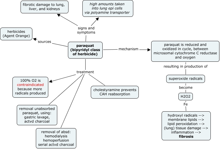 This Concept Map, created with IHMC CmapTools, has information related to: therapy for pesticide and drug poisoning - paraquat, paraquat (bipyridyl class of herbicide) treatment removal unabsorbed paraquat, using: gastric lavage, actvd charcoal, paraquat (bipyridyl class of herbicide) sources herbicides (Agent Orange), paraquat (bipyridyl class of herbicide) signs and symptoms high amounts taken into lung epi cells via polyamine transporter, paraquat (bipyridyl class of herbicide) signs and symptoms fibrotic damage to lung, liver, and kidneys, paraquat (bipyridyl class of herbicide) treatment removal of absd: hemodialysis hemoperfusion serial actvd charcoal, paraquat is reduced and oxidized in cycle, between microsomal cytochrome C reductase and oxygen resulting in production of superoxide radicals, paraquat (bipyridyl class of herbicide) mechanism paraquat is reduced and oxidized in cycle, between microsomal cytochrome C reductase and oxygen, superoxide radicals become H2O2, H2O2 Fe hydroxyl radicals --> membrane lipids --> lipid peroxidation --> (lung) tissue damage --> inflammation --> fibrosis, paraquat (bipyridyl class of herbicide) treatment cholestyramine prevents CAH reabsorption, paraquat (bipyridyl class of herbicide) treatment 100% O2 is contraindicated because more radicals produced