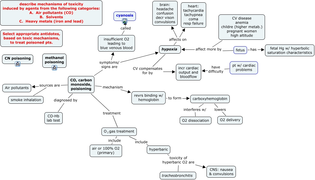 This Concept Map, created with IHMC CmapTools, has information related to: antidotes for toxic agents, fetus has fetal Hg w/ hyperbolic saturation characteristics, hypoxia affects on heart: tachycardia tachypnea coma resp failure, hyperbaric toxicity of hyperbaric O2 are tracheobronchitis, CO, carbon monoxide, poisioning mechanism revrs binding w/ hemoglobin, CO, carbon monoxide, poisioning sources are smoke inhalation, carboxyhemoglobin lowers O2 delivery, insufficient O2 leading to blue venous blood called cyanosis, fetus affect more by hypoxia, CO, carbon monoxide, poisioning symptoms/ signs are hypoxia, CO, carbon monoxide, poisioning sources are Air pollutants, <math xmlns="http://www.w3.org/1998/Math/MathML"> <mrow> <mmultiscripts> <mtext> O </mtext> <mtext> 2 </mtext> <none/> </mmultiscripts> <mtext> gas treatment </mtext> </mrow> </math> include hyperbaric, CO, carbon monoxide, poisioning treatment <math xmlns="http://www.w3.org/1998/Math/MathML"> <mrow> <mmultiscripts> <mtext> O </mtext> <mtext> 2 </mtext> <none/> </mmultiscripts> <mtext> gas treatment </mtext> </mrow> </math>, hypoxia CV compensates for by incr cardiac output and bloodflow, CV disease anemia childre (higher metab.) pregnant women high altitude affect more by hypoxia, CO, carbon monoxide, poisioning symptoms/ signs are insufficient O2 leading to blue venous blood, pt w/ cardiac problems have difficulty incr cardiac output and bloodflow, CO, carbon monoxide, poisioning diagnosed by CO-Hb lab test, <math xmlns="http://www.w3.org/1998/Math/MathML"> <mrow> <mmultiscripts> <mtext> O </mtext> <mtext> 2 </mtext> <none/> </mmultiscripts> <mtext> gas treatment </mtext> </mrow> </math> include air or 100% O2 (primary), revrs binding w/ hemoglobin to form carboxyhemoglobin, carboxyhemoglobin interferes w/ O2 dissociation