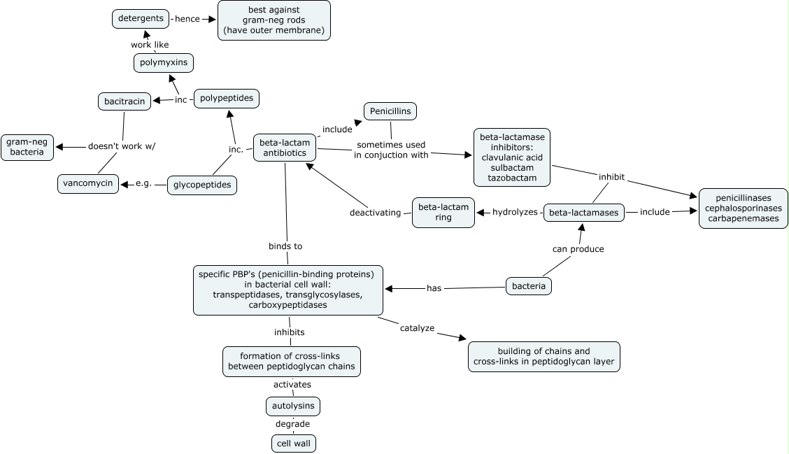 This Concept Map, created with IHMC CmapTools, has information related to: antibacterial agents - beta-lactam antibiotics, bacitracin doesn't work w/ gram-neg bacteria, bacteria can produce beta-lactamases, specific PBP's (penicillin-binding proteins) in bacterial cell wall: transpeptidases, transglycosylases, carboxypeptidases catalyze building of chains and cross-links in peptidoglycan layer, beta-lactamases hydrolyzes beta-lactam ring, bacteria has specific PBP's (penicillin-binding proteins) in bacterial cell wall: transpeptidases, transglycosylases, carboxypeptidases, beta-lactamases include penicillinases cephalosporinases carbapenemases, beta-lactam ring deactivating beta-lactam antibiotics, beta-lactam antibiotics include Penicillins, polypeptides inc bacitracin, detergents hence best against gram-neg rods (have outer membrane), beta-lactamase inhibitors: clavulanic acid sulbactam tazobactam inhibit penicillinases cephalosporinases carbapenemases, beta-lactamase inhibitors: clavulanic acid sulbactam tazobactam inhibit beta-lactamases, glycopeptides e.g. vancomycin, vancomycin doesn't work w/ gram-neg bacteria, beta-lactam antibiotics sometimes used in conjuction with beta-lactamase inhibitors: clavulanic acid sulbactam tazobactam, beta-lactam antibiotics inc. polypeptides, specific PBP's (penicillin-binding proteins) in bacterial cell wall: transpeptidases, transglycosylases, carboxypeptidases inhibits formation of cross-links between peptidoglycan chains, beta-lactam antibiotics binds to specific PBP's (penicillin-binding proteins) in bacterial cell wall: transpeptidases, transglycosylases, carboxypeptidases, polypeptides inc polymyxins, Penicillins sometimes used in conjuction with beta-lactamase inhibitors: clavulanic acid sulbactam tazobactam