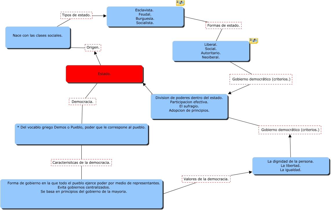 Este Cmap, tiene información relacionada con: MAPA CONCEPTUAL, Division de poderes dentro del estado. Participacion efectiva. El sufragio. Adopcion de principios. ???? Estado., Estado. Democracia. * Del vocablo griego Demos o Pueblo, poder que le correspone al pueblo., Nace con las clases sociales. Tipos de estado. Esclavista. Feudal. Burguesía. Socialista., Forma de gobierno en la que todo el pueblo ejerce poder por medio de representantes. Evita gobiernos centralizados. Se basa en principios del gobierno de la mayoria. Valores de la democracia. La dignidad de la persona. La libertad. La igualdad., Liberal. Social. Autoritario. Neoiberal. Gobierno democrático (criterios.) Division de poderes dentro del estado. Participacion efectiva. El sufragio. Adopcion de principios.