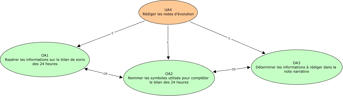 Cette carte de concepts créée avec IHMC CmapTools traite de: UA4 lab, UA4 Rédiger les notes d'évolution c OA3 Déterminer les informations à rédiger dans la note narrative, UA4 Rédiger les notes d'évolution c OA1 Repérer les informations sur le bilan de soins des 24 heures, UA4 Rédiger les notes d'évolution c OA2 Nommer les symboles utilisés pour compléter le bilan des 24 heures