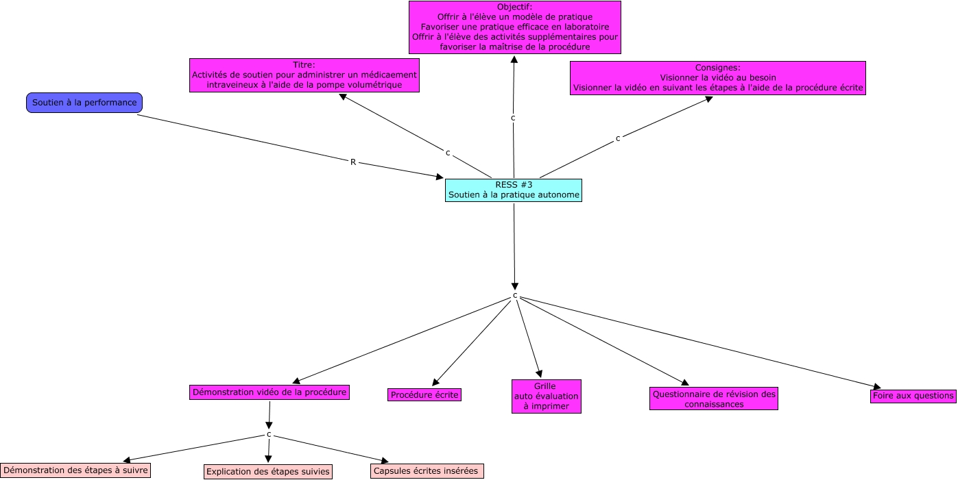 Cette carte de concepts créée avec IHMC CmapTools traite de: RESS3-Soutien, Démonstration vidéo de la procédure c Capsules écrites insérées, RESS #3 Soutien à la pratique autonome c Titre: Activités de soutien pour administrer un médicaement intraveineux à l'aide de la pompe volumétrique, RESS #3 Soutien à la pratique autonome c Consignes: Visionner la vidéo au besoin Visionner la vidéo en suivant les étapes à l'aide de la procédure écrite, RESS #3 Soutien à la pratique autonome c Foire aux questions, RESS #3 Soutien à la pratique autonome c Grille auto évaluation à imprimer, RESS #3 Soutien à la pratique autonome c Objectif: Offrir à l'élève un modèle de pratique Favoriser une pratique efficace en laboratoire Offrir à l'élève des activités supplémentaires pour favoriser la maîtrise de la procédure, Démonstration vidéo de la procédure c Explication des étapes suivies, Démonstration vidéo de la procédure c Démonstration des étapes à suivre, RESS #3 Soutien à la pratique autonome c Questionnaire de révision des connaissances, RESS #3 Soutien à la pratique autonome c Procédure écrite, RESS #3 Soutien à la pratique autonome c Démonstration vidéo de la procédure