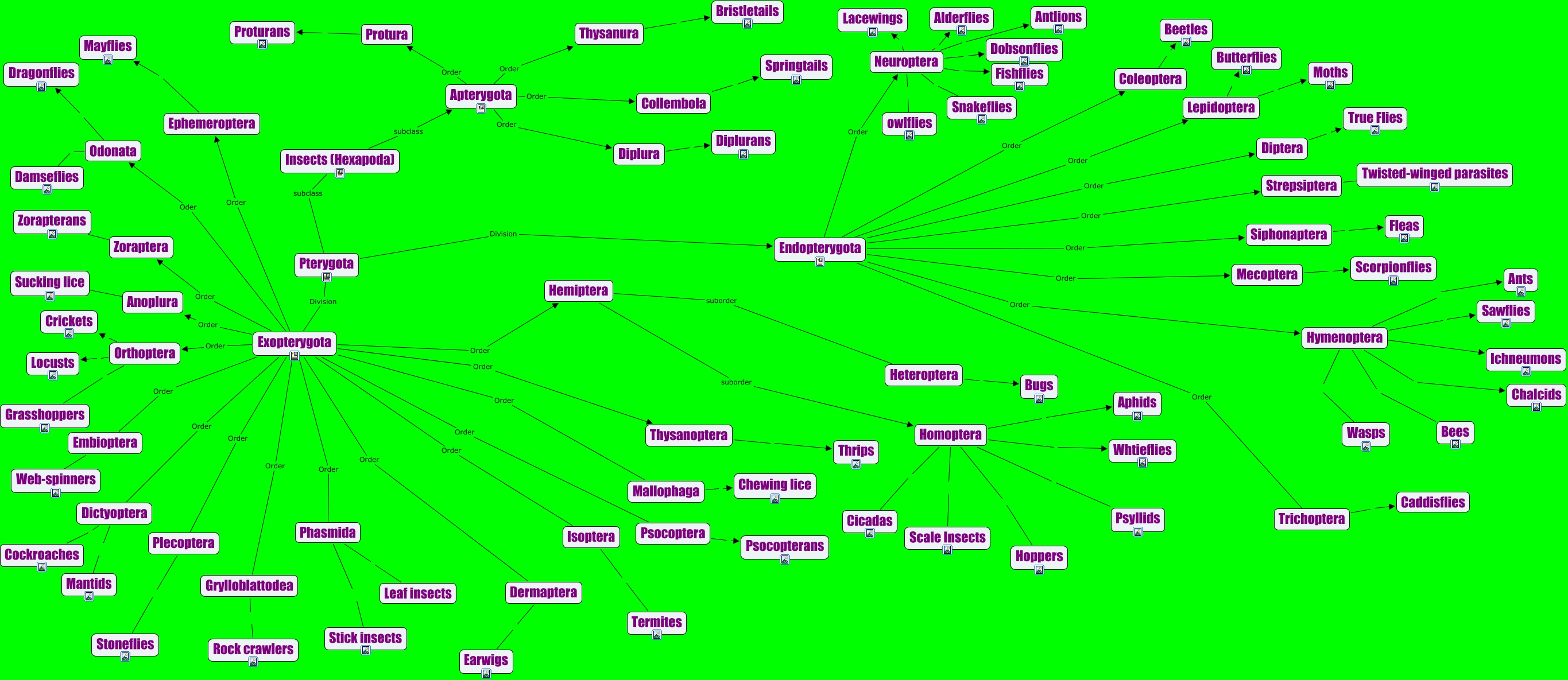 This Concept Map, created with IHMC CmapTools, has information related to: Insect Classification, Apterygota Order Collembola, Lepidoptera Butterflies, Hymenoptera Bees, Pterygota Division Exopterygota, Endopterygota Order Mecoptera, Strepsiptera Twisted-winged parasites, Apterygota Order Thysanura, Protura Proturans, Phasmida Stick insects, Lepidoptera Moths, Neuroptera Lacewings, Endopterygota Order Strepsiptera, Endopterygota Order Lepidoptera, Embioptera Web-spinners, Grylloblattodea Rock crawlers, Hymenoptera Ichneumons, Homoptera Scale Insects, Dictyoptera Mantids, Siphonaptera Fleas, Orthoptera Locusts