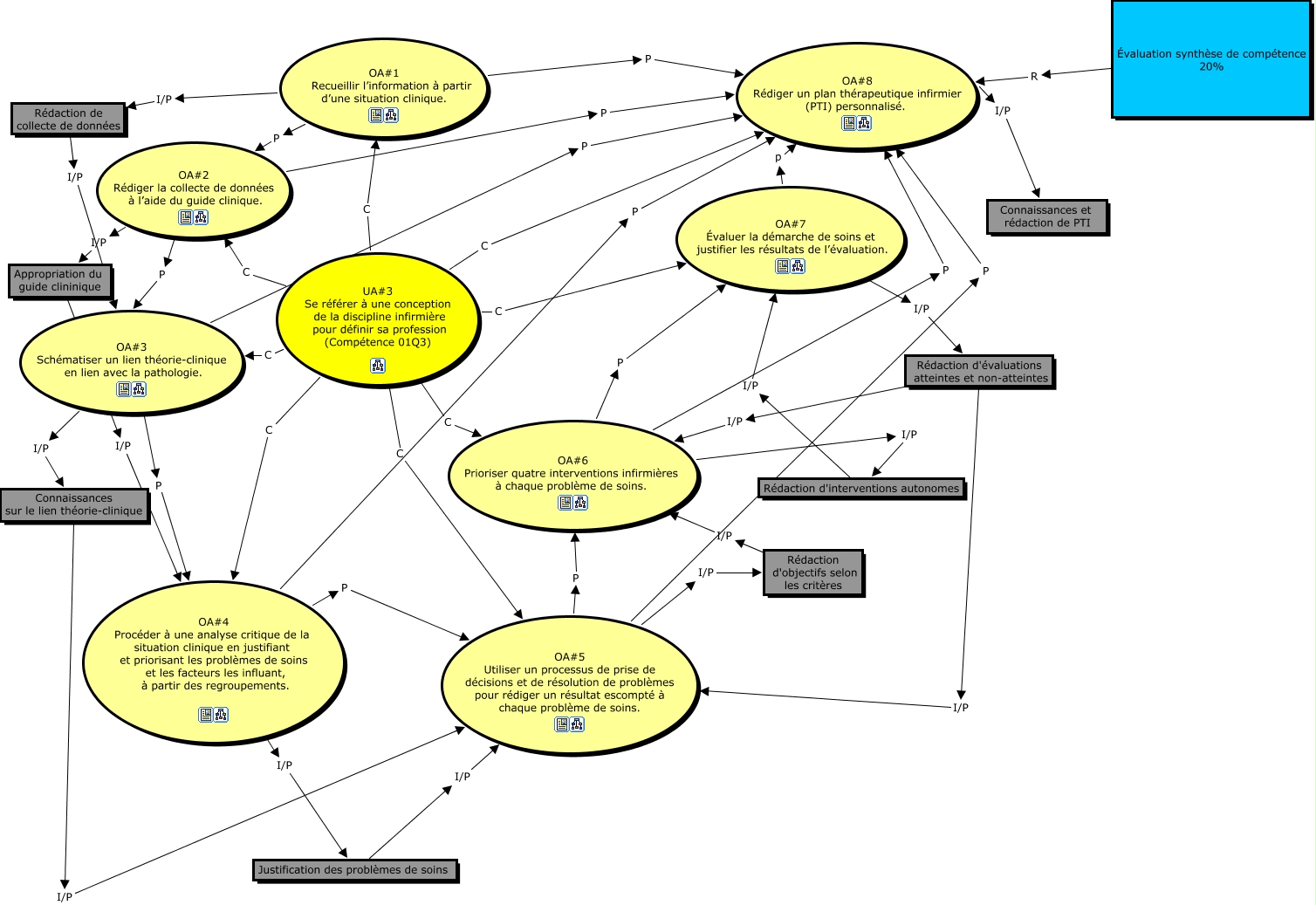 Cette carte de concepts créée avec IHMC CmapTools traite de: UA3, UA#3 Se référer à une conception de la discipline infirmière pour définir sa profession (Compétence 01Q3) C OA#7 Évaluer la démarche de soins et justifier les résultats de l’évaluation., OA#7 Évaluer la démarche de soins et justifier les résultats de l’évaluation. p OA#8 Rédiger un plan thérapeutique infirmier (PTI) personnalisé., OA#6 Prioriser quatre interventions infirmières à chaque problème de soins. P OA#8 Rédiger un plan thérapeutique infirmier (PTI) personnalisé., UA#3 Se référer à une conception de la discipline infirmière pour définir sa profession (Compétence 01Q3) C OA#3 Schématiser un lien théorie-clinique en lien avec la pathologie., OA#1 Recueillir l’information à partir d’une situation clinique. I/P Rédaction de collecte de données, OA#2 Rédiger la collecte de données à l’aide du guide clinique. P OA#8 Rédiger un plan thérapeutique infirmier (PTI) personnalisé., Rédaction d'interventions autonomes I/P OA#7 Évaluer la démarche de soins et justifier les résultats de l’évaluation., OA#1 Recueillir l’information à partir d’une situation clinique. P OA#2 Rédiger la collecte de données à l’aide du guide clinique., OA#1 Recueillir l’information à partir d’une situation clinique. P OA#8 Rédiger un plan thérapeutique infirmier (PTI) personnalisé., UA#3 Se référer à une conception de la discipline infirmière pour définir sa profession (Compétence 01Q3) C OA#4 Procéder à une analyse critique de la situation clinique en justifiant et priorisant les problèmes de soins et les facteurs les influant, à partir des regroupements., Appropriation du guide clininique I/P OA#4 Procéder à une analyse critique de la situation clinique en justifiant et priorisant les problèmes de soins et les facteurs les influant, à partir des regroupements., OA#3 Schématiser un lien théorie-clinique en lien avec la pathologie. I/P Connaissances sur le lien théorie-clinique, OA#3 Schématiser un lien théorie-clinique en lien avec la pathologie. P OA#4 Procéder à une analyse critique de la situation clinique en justifiant et priorisant les problèmes de soins et les facteurs les influant, à partir des regroupements., OA#6 Prioriser quatre interventions infirmières à chaque problème de soins. P OA#7 Évaluer la démarche de soins et justifier les résultats de l’évaluation., OA#2 Rédiger la collecte de données à l’aide du guide clinique. I/P Appropriation du guide clininique, OA#7 Évaluer la démarche de soins et justifier les résultats de l’évaluation. I/P Rédaction d'évaluations atteintes et non-atteintes, OA#6 Prioriser quatre interventions infirmières à chaque problème de soins. I/P Rédaction d'interventions autonomes, OA#5 Utiliser un processus de prise de décisions et de résolution de problèmes pour rédiger un résultat escompté à chaque problème de soins. I/P Rédaction d'objectifs selon les critères, OA#3 Schématiser un lien théorie-clinique en lien avec la pathologie. P OA#8 Rédiger un plan thérapeutique infirmier (PTI) personnalisé., Rédaction d'évaluations atteintes et non-atteintes I/P OA#5 Utiliser un processus de prise de décisions et de résolution de problèmes pour rédiger un résultat escompté à chaque problème de soins.