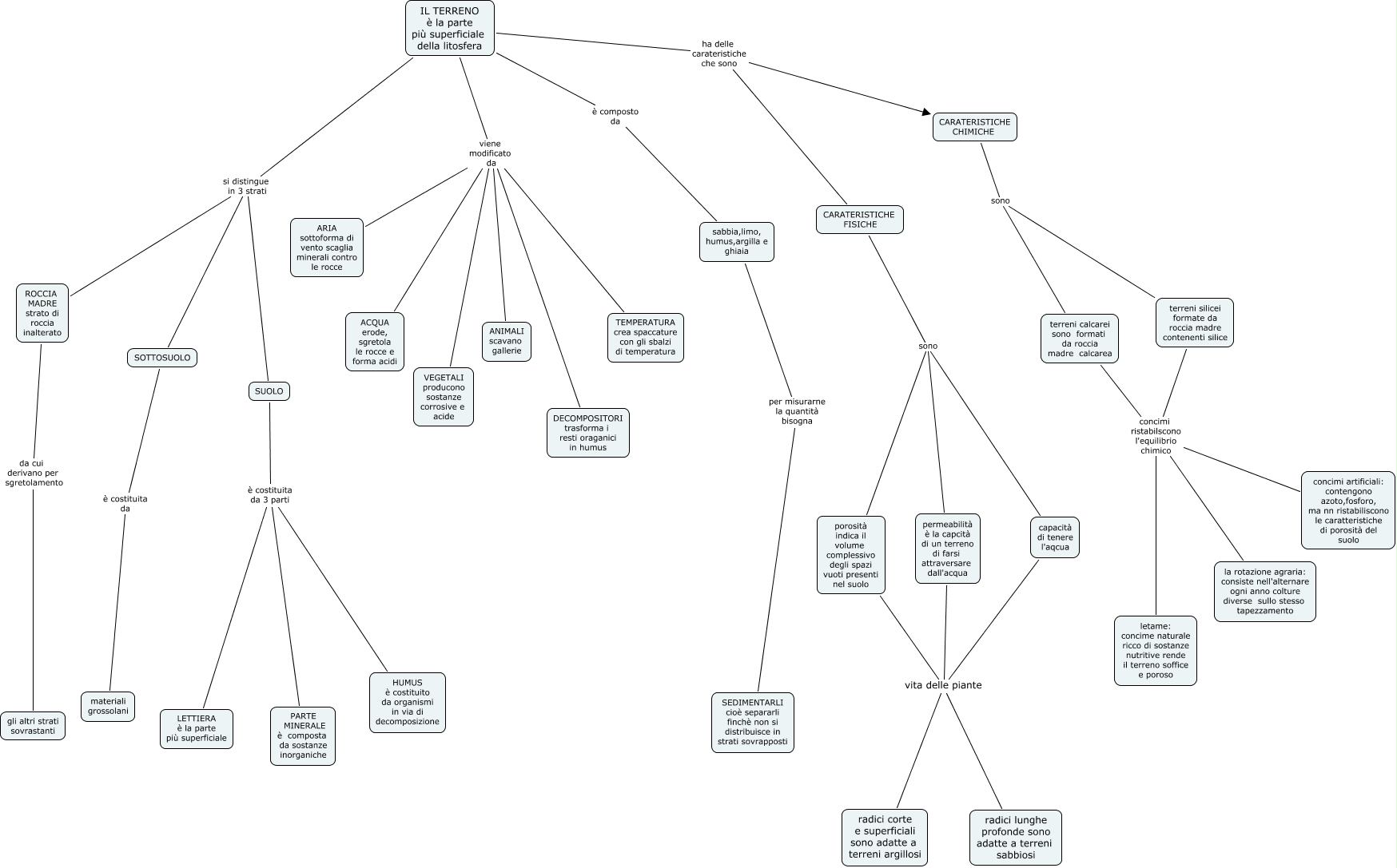 Questa Cmap, creata con IHMC CmapTools, contiene informazioni relative a: capitolo suolo ery fra bea mary, capacità di tenere l'aqcua vita delle piante radici corte e superficiali sono adatte a terreni argillosi, IL TERRENO è la parte più superficiale della litosfera si distingue in 3 strati ROCCIA MADRE strato di roccia inalterato, porosità indica il volume complessivo degli spazi vuoti presenti nel suolo vita delle piante radici lunghe profonde sono adatte a terreni sabbiosi, IL TERRENO è la parte più superficiale della litosfera si distingue in 3 strati SUOLO, IL TERRENO è la parte più superficiale della litosfera viene modificato da ARIA sottoforma di vento scaglia minerali contro le rocce, IL TERRENO è la parte più superficiale della litosfera ha delle carateristiche che sono CARATERISTICHE CHIMICHE, CARATERISTICHE CHIMICHE sono terreni silicei formate da roccia madre contenenti silice, terreni silicei formate da roccia madre contenenti silice concimi ristabilscono l'equilibrio chimico letame: concime naturale ricco di sostanze nutritive rende il terreno soffice e poroso, SUOLO è costituita da 3 parti HUMUS è costituito da organismi in via di decomposizione, CARATERISTICHE FISICHE sono capacità di tenere l'aqcua, porosità indica il volume complessivo degli spazi vuoti presenti nel suolo vita delle piante radici corte e superficiali sono adatte a terreni argillosi, SOTTOSUOLO è costituita da materiali grossolani, IL TERRENO è la parte più superficiale della litosfera viene modificato da TEMPERATURA crea spaccature con gli sbalzi di temperatura, terreni silicei formate da roccia madre contenenti silice concimi ristabilscono l'equilibrio chimico la rotazione agraria: consiste nell'alternare ogni anno colture diverse sullo stesso tapezzamento, IL TERRENO è la parte più superficiale della litosfera viene modificato da DECOMPOSITORI trasforma i resti oraganici in humus, capacità di tenere l'aqcua vita delle piante radici lunghe profonde sono adatte a terreni sabbiosi, IL TERRENO è la parte più superficiale della litosfera ha delle carateristiche che sono CARATERISTICHE FISICHE, IL TERRENO è la parte più superficiale della litosfera viene modificato da ACQUA erode, sgretola le rocce e forma acidi, CARATERISTICHE CHIMICHE sono terreni calcarei sono formati da roccia madre calcarea, terreni calcarei sono formati da roccia madre calcarea concimi ristabilscono l'equilibrio chimico letame: concime naturale ricco di sostanze nutritive rende il terreno soffice e poroso