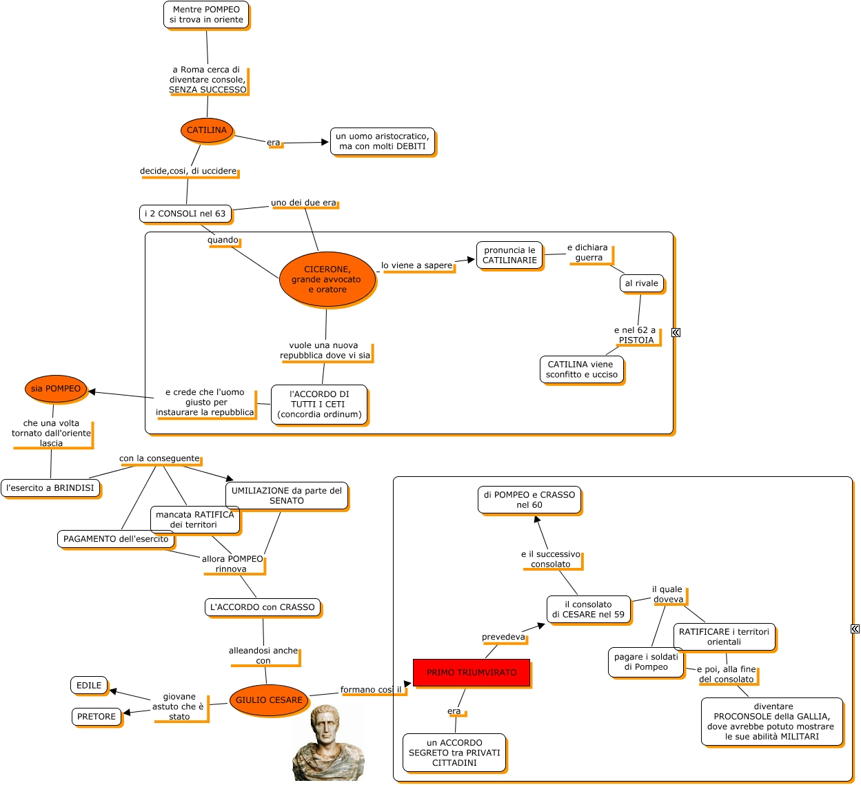 Questa Cmap, creata con IHMC CmapTools, contiene informazioni relative a: il primo triumvirato(balzi), l'esercito a BRINDISI con la conseguente mancata RATIFICA dei territori, PRIMO TRIUMVIRATO prevedeva il consolato di CESARE nel 59, CICERONE, grande avvocato e oratore vuole una nuova repubblica dove vi sia l'ACCORDO DI TUTTI I CETI (concordia ordinum), al rivale e nel 62 a PISTOIA CATILINA viene sconfitto e ucciso, Mentre POMPEO si trova in oriente a Roma cerca di diventare console, SENZA SUCCESSO CATILINA, PAGAMENTO dell'esercito allora POMPEO rinnova L'ACCORDO con CRASSO, CATILINA decide,cosi, di uccidere i 2 CONSOLI nel 63, pagare i soldati di Pompeo e poi, alla fine del consolato diventare PROCONSOLE della GALLIA, dove avrebbe potuto mostrare le sue abilità MILITARI, mancata RATIFICA dei territori allora POMPEO rinnova L'ACCORDO con CRASSO, pronuncia le CATILINARIE e dichiara guerra al rivale, GIULIO CESARE formano così il PRIMO TRIUMVIRATO, l'esercito a BRINDISI con la conseguente PAGAMENTO dell'esercito, i 2 CONSOLI nel 63 quando CICERONE, grande avvocato e oratore, i 2 CONSOLI nel 63 uno dei due era CICERONE, grande avvocato e oratore, il consolato di CESARE nel 59 il quale doveva RATIFICARE i territori orientali, CATILINA era un uomo aristocratico, ma con molti DEBITI, il consolato di CESARE nel 59 il quale doveva pagare i soldati di Pompeo, GIULIO CESARE giovane astuto che è stato PRETORE, il consolato di CESARE nel 59 e il successivo consolato di POMPEO e CRASSO nel 60, l'esercito a BRINDISI con la conseguente UMILIAZIONE da parte del SENATO