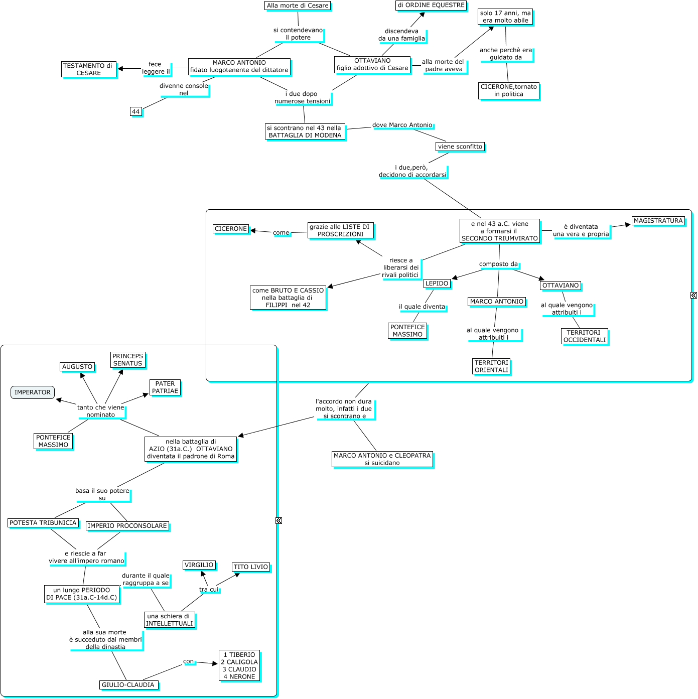 Questa Cmap, creata con IHMC CmapTools, contiene informazioni relative a: augusto (balzi), OTTAVIANO figlio adottivo di Cesare i due dopo numerose tensioni si scontrano nel 43 nella BATTAGLIA DI MODENA, una schiera di INTELLETTUALI tra cui VIRGILIO, MARCO ANTONIO fidato luogotenente del dittatore fece leggere il TESTAMENTO di CESARE, GIULIO-CLAUDIA con 1 TIBERIO 2 CALIGOLA 3 CLAUDIO 4 NERONE, MARCO ANTONIO al quale vengono attribuiti i TERRITORI ORIENTALI, un lungo PERIODO DI PACE (31a.C-14d.C) durante il quale raggruppa a se una schiera di INTELLETTUALI, nella battaglia di AZIO (31a.C.) OTTAVIANO diventata il padrone di Roma tanto che viene nominato PRINCEPS SENATUS, e nel 43 a.C. viene a formarsi il SECONDO TRIUMVIRATO composto da MARCO ANTONIO, viene sconfitto i due,però, decidono di accordarsi e nel 43 a.C. viene a formarsi il SECONDO TRIUMVIRATO, e nel 43 a.C. viene a formarsi il SECONDO TRIUMVIRATO riesce a liberarsi dei rivali politici grazie alle LISTE DI PROSCRIZIONI, nella battaglia di AZIO (31a.C.) OTTAVIANO diventata il padrone di Roma basa il suo potere su IMPERIO PROCONSOLARE, OTTAVIANO al quale vengono attribuiti i TERRITORI OCCIDENTALI, nella battaglia di AZIO (31a.C.) OTTAVIANO diventata il padrone di Roma tanto che viene nominato PATER PATRIAE, Alla morte di Cesare si contendevano il potere OTTAVIANO figlio adottivo di Cesare, Alla morte di Cesare si contendevano il potere MARCO ANTONIO fidato luogotenente del dittatore, IL SECONDO TRIUMVIRATO l'accordo non dura molto, infatti i due si scontrano e MARCO ANTONIO e CLEOPATRA si suicidano, nella battaglia di AZIO (31a.C.) OTTAVIANO diventata il padrone di Roma tanto che viene nominato IMPERATOR, IL SECONDO TRIUMVIRATO l'accordo non dura molto, infatti i due si scontrano e nella battaglia di AZIO (31a.C.) OTTAVIANO diventata il padrone di Roma, solo 17 anni, ma era molto abile anche perchè era guidato da CICERONE,tornato in politica, un lungo PERIODO DI PACE (31a.C-14d.C) alla sua morte è succeduto dai membri della dinastia GIULIO-CLAUDIA