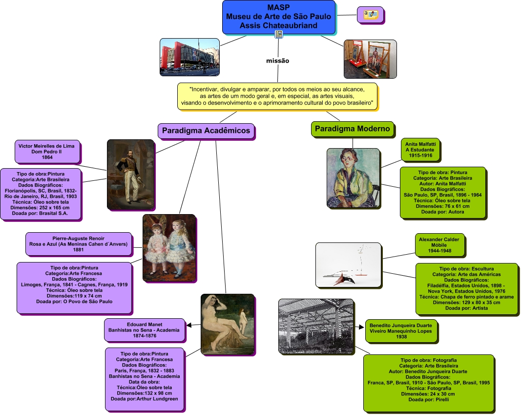 Esse mapa conceitual, produzido no IHMC CmapTools, tem a informação relacionada a: MASP, Paradigma Acadêmicos ????, ???? MASP Museu de Arte de São Paulo Assis Chateaubriand, ???? Tipo de obra: Escultura Categoria: Arte das Américas Dados Biográficos: Filadélfia, Estados Unidos, 1898 - Nova York, Estados Unidos, 1976 Técnica: Chapa de ferro pintado e arame Dimensões: 129 x 80 x 35 cm Doada por: Artista, Paradigma Acadêmicos ????, "Incentivar, divulgar e amparar, por todos os meios ao seu alcance, as artes de um modo geral e, em especial, as artes visuais, visando o desenvolvimento e o aprimoramento cultural do povo brasileiro" ???? Paradigma Acadêmicos, ???? Tipo de obra:Pintura Categoria:Arte Francesa Dados Biográficos: Paris, França, 1832 - 1883 Banhistas no Sena - Academia Data da obra: Técnica:Óleo sobre tela Dimensões:132 x 98 cm Doada por:Arthur Lundgreen, ???? Anita Malfatti A Estudante 1915-1916, ???? Benedito Junqueira Duarte Viveiro Manequinho Lopes 1938, Paradigma Acadêmicos ????, ???? Edouard Manet Banhistas no Sena - Academia 1874-1876, "Incentivar, divulgar e amparar, por todos os meios ao seu alcance, as artes de um modo geral e, em especial, as artes visuais, visando o desenvolvimento e o aprimoramento cultural do povo brasileiro" ???? Paradigma Moderno, MASP Museu de Arte de São Paulo Assis Chateaubriand missão "Incentivar, divulgar e amparar, por todos os meios ao seu alcance, as artes de um modo geral e, em especial, as artes visuais, visando o desenvolvimento e o aprimoramento cultural do povo brasileiro", Paradigma Moderno ????, ???? Tipo de obra: Pintura Categoria: Arte Brasileira Autor: Anita Malfatti Dados Biográficos: São Paulo, SP, Brasil, 1896 - 1964 Técnica: Óleo sobre tela Dimensões: 76 x 61 cm Doada por: Autora, MASP Museu de Arte de São Paulo Assis Chateaubriand ????, ???? Tipo de obra: Fotografia Categoria: Arte Brasileira Autor: Benedito Junqueira Duarte Dados Biográficos: Franca, SP, Brasil, 1910 - São Paulo, SP, Brasil, 1995 Técnica: Fotografia Dimensões: 24 x 30 cm Doada por: Pirelli, ???? Tipo de obra:Pintura Categoria:Arte Francesa Dados Biográficos: Limoges, França, 1841 - Cagnes, França, 1919 Técnica: Óleo sobre tela Dimensões:119 x 74 cm Doada por: O Povo de São Paulo, MASP Museu de Arte de São Paulo Assis Chateaubriand ????, ???? Tipo de obra:Pintura Categoria:Arte Brasileira Dados Biográficos: Florianópolis, SC, Brasil, 1832- Rio de Janeiro, RJ, Brasil, 1903 Técnica: Óleo sobre tela Dimensões: 252 x 165 cm Doada por: Brasital S.A., ???? Pierre-Auguste Renoir Rosa e Azul (As Meninas Cahen d´Anvers) 1881