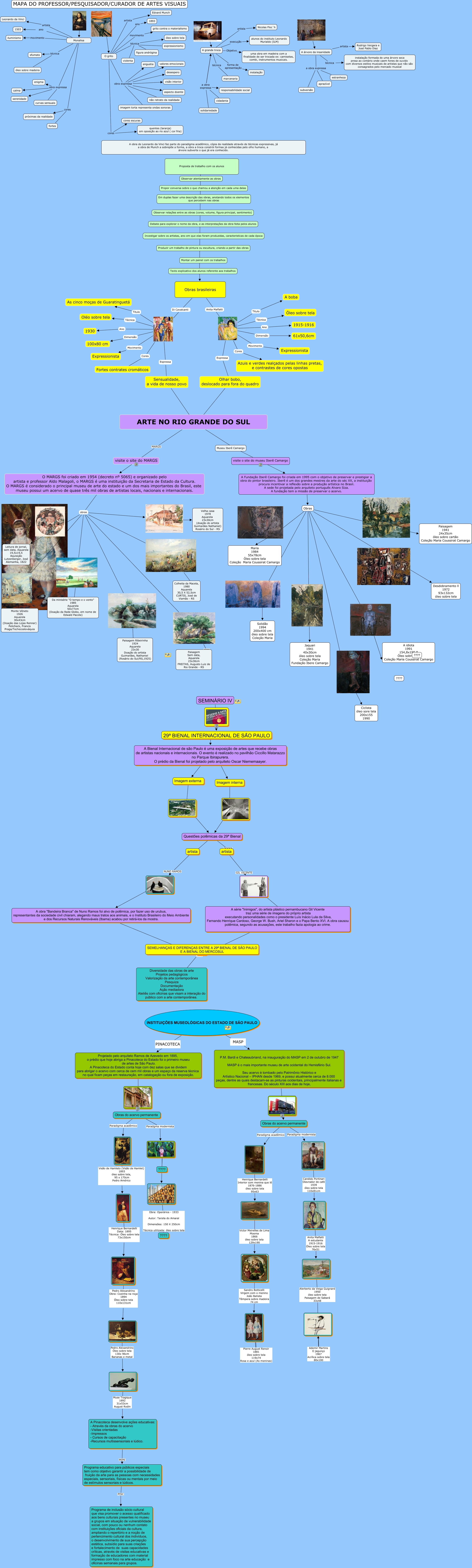 Esse mapa conceitual, produzido no IHMC CmapTools, tem a informação relacionada a: MAPA PROFESSOR PESQUISADOR atualizado, Obras do acervo permanente Paradigma acadêmico, Técnica Oléo sobre tela, Obras brasileiras Anita Malfatti, Ano 1930, Imagem interna ????, Programa educativo para públicos especiais tem como objetivo garantir a possibilidade de fruição da arte para as pessoas com necessidades especiais, sensoriais, físicas ou mentais por meio de estímulos sensoriais e lúdicos. PISC Programa de inclusão sócio cultural que visa promover o acesso qualificado aos bens culturais presentes no museu a grupos em situação de vulnerabilidade social, com pouco ou nenhum contato com instituições oficiais da cultura, ampliando o repertório e a noção de pertencimento cultural dos indivíduos, o desenvolvimento de sua percepção estética, subsídio para suas criações e fortalecimento de suas capacidades críticas, através de visitas educativas e formação de educadores com material impresso com foco na arte educação e oficinas semanais para grupos., Expressa Olhar bobo, deslocado para fora do quadro, Obras ???? Maria 1984 55x78cm Óleo sobre tela Coleção Maria Coussirat Camargo, A grande troca técnica marcenaria, Monalisa ano 1503, Monalisa obra expressa calma, A árvore da insanidade a obra expressa aprazível, O grito obra expressa valores emocionais, A grande troca artista Nicolas Floc´h, A obra "Bandeira Branca" de Nuno Ramos foi alvo de polêmica, por fazer uso de urubus, representantes da sociedade civil chiaram, alegando maus tratos aos animais, e o Instituto Brasileiro do Meio Ambiente e dos Recursos Naturais Renováveis (Ibama) acabou por retirá-los da mostra. ???? ????, ???? A árvore da insanidade, Técnica Óleo sobre tela, P.M. Bardi e Chateaubriand, na inauguração do MASP em 2 de outubro de 1947 MASP é o mais importante museu de arte ocidental do Hemisfério Sul. Seu acervo é tombado pelo Patrimônio Histórico e Artístico Nacional – IPHAN desde 1969, e possui atualmente cerca de 8.000 peças, dentre as quais destacam-se as pinturas ocidentais, principalmente italianas e francesas. Do século XIII aos dias de hoje, ????, O grito ano 1893, O MARGS foi criado em 1954 (decreto nº 5065) e organizado pelo artista e professor Aldo Malagoli, o MARGS é uma instituição da Secretaria de Estado da Cultura. O MARGS é considerado o principal museu de arte do estado e um dos mais importantes do Brasil, este museu possui um acervo de quase três mil obras de artistas locais, nacionais e internacionais. obras