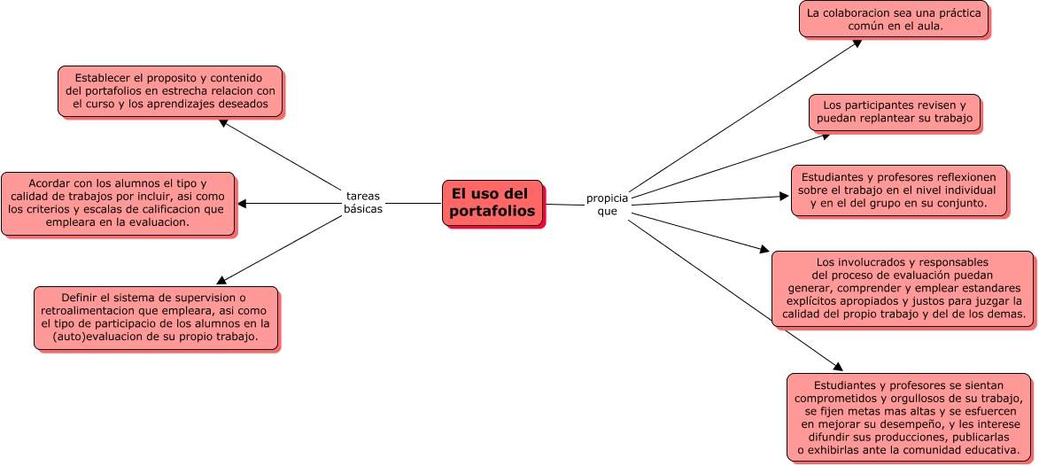 Este Cmap, tiene información relacionada con: Capítulo 5.5, El uso del portafolios propicia que Los involucrados y responsables del proceso de evaluación puedan generar, comprender y emplear estandares explícitos apropiados y justos para juzgar la calidad del propio trabajo y del de los demas., El uso del portafolios tareas básicas Acordar con los alumnos el tipo y calidad de trabajos por incluir, asi como los criterios y escalas de calificacion que empleara en la evaluacion., El uso del portafolios propicia que Los participantes revisen y puedan replantear su trabajo, El uso del portafolios propicia que Estudiantes y profesores se sientan comprometidos y orgullosos de su trabajo, se fijen metas mas altas y se esfuercen en mejorar su desempeño, y les interese difundir sus producciones, publicarlas o exhibirlas ante la comunidad educativa., El uso del portafolios tareas básicas Establecer el proposito y contenido del portafolios en estrecha relacion con el curso y los aprendizajes deseados, El uso del portafolios propicia que La colaboracion sea una práctica común en el aula., El uso del portafolios tareas básicas Definir el sistema de supervision o retroalimentacion que empleara, asi como el tipo de participacio de los alumnos en la (auto)evaluacion de su propio trabajo., El uso del portafolios propicia que Estudiantes y profesores reflexionen sobre el trabajo en el nivel individual y en el del grupo en su conjunto.