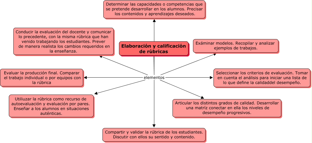 Este Cmap, tiene información relacionada con: Capítulo 5.3, Elaboración y calificación de rúbricas elementos Utiliuzar la rúbrica como recurso de autoevaluación y evaluación por pares. Enseñar a los alumnos en situaciones auténticas., Elaboración y calificación de rúbricas elementos Conducir la evaluación del docente y comunicar lo precedente, con la misma rúbrica que han venido trabajando los estudiantes. Prever de manera realista los cambios requeridos en la enseñanza., Elaboración y calificación de rúbricas elementos Determinar las capacidades o competencias que se pretende desarrollar en los alumnos. Precisar los contenidos y aprendizajes deseados., Elaboración y calificación de rúbricas elementos Exáminar modelos. Recopilar y analizar ejemplos de trabajos., Elaboración y calificación de rúbricas elementos Seleccionar los criterios de evaluación. Tomar en cuenta el análisis para iniciar una lista de lo que define la calidaddel desempeño., Elaboración y calificación de rúbricas elementos Evaluar la producción final. Comparar el trabajo individual o por equipos con la rúbrica, Elaboración y calificación de rúbricas elementos Compartir y validar la rúbrica de los estudiantes. Discutir con ellos su sentido y contenido., Elaboración y calificación de rúbricas elementos Articular los distintos grados de calidad. Desarrollar una matríz conectar en ella los niveles de desempeño progresivos.